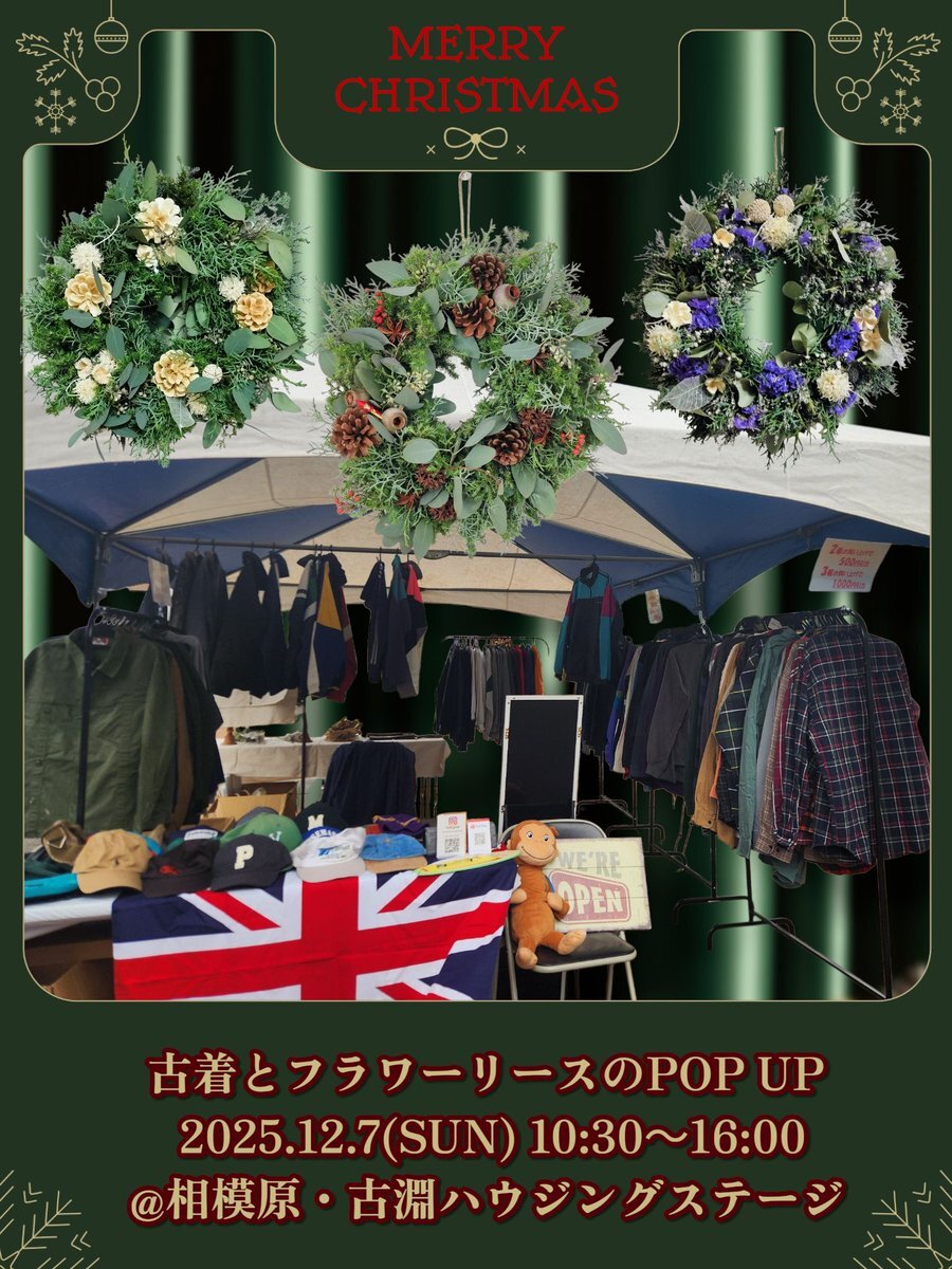 12/7(日)古着とフラワーリースのPOP UP開催!アメカジメインの古着と、元花屋によるハンドメイドのクリスマスフラワーリースを販売。お近くにお住まいの方は是非お越し下さいませ #古着popup #フラワーリース #フラワーアレンジメント #フラワーギフト #古淵 #古着相模原 #古着相模大野 #古着町田 pic.x.com/BOc7uwF4Nv