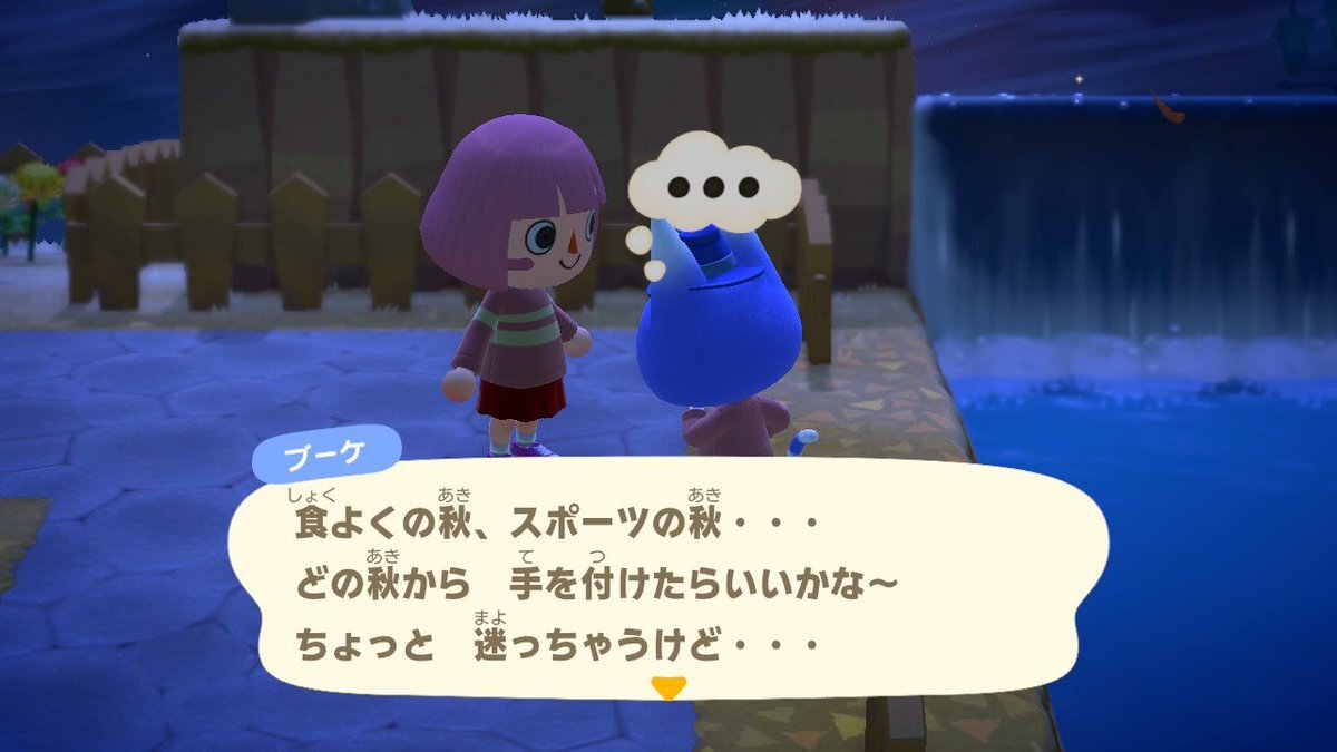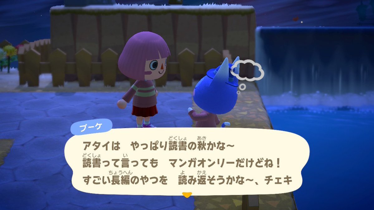 あゆみ「ブーケちゃんの秋は読書の秋なんだね🍂 わたしもどの秋にしようか迷うな」 #AnimalCrossing #あつ森 #あつまれどうぶつの森 #サブ島 #ブーケ pic.x.com/vkEMTofnVw