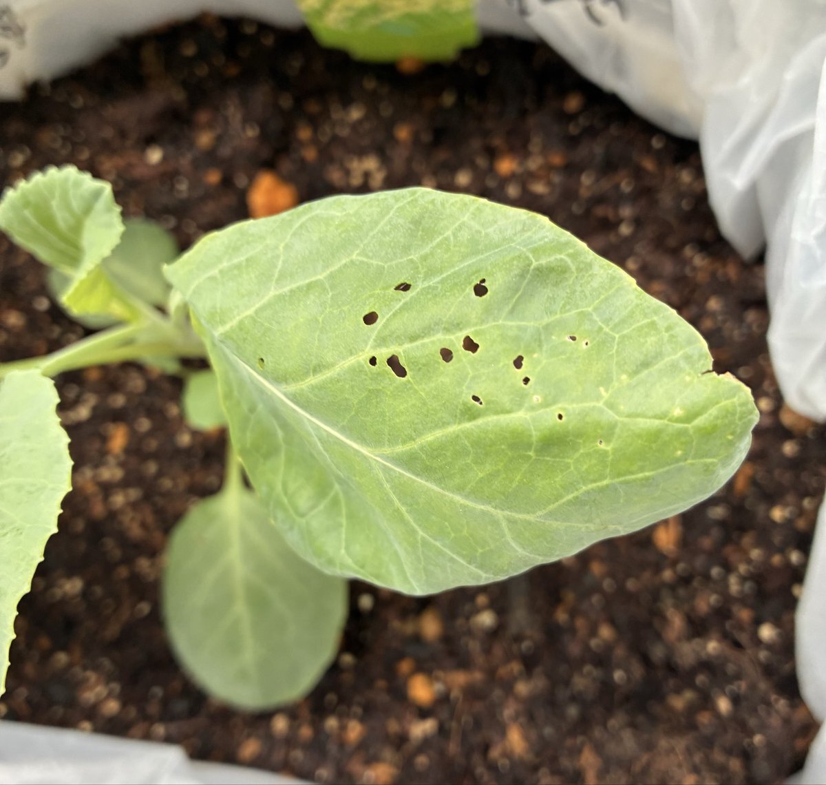 ⭐️植えて一週間の、カリフローレに穴が開いた!誰だ?ひょっとしたら、あのはらぺこさん ⭐️絵本「はらぺこあおむし」は、生まれたての赤ちゃんにこそ読み聞かせるベストブック❗️ ⭐️赤、青、緑の色合いは、視力の未発達な新生児でもOK。でも、うちの子たちには近寄らないで‼️ #家庭菜園 #絵本