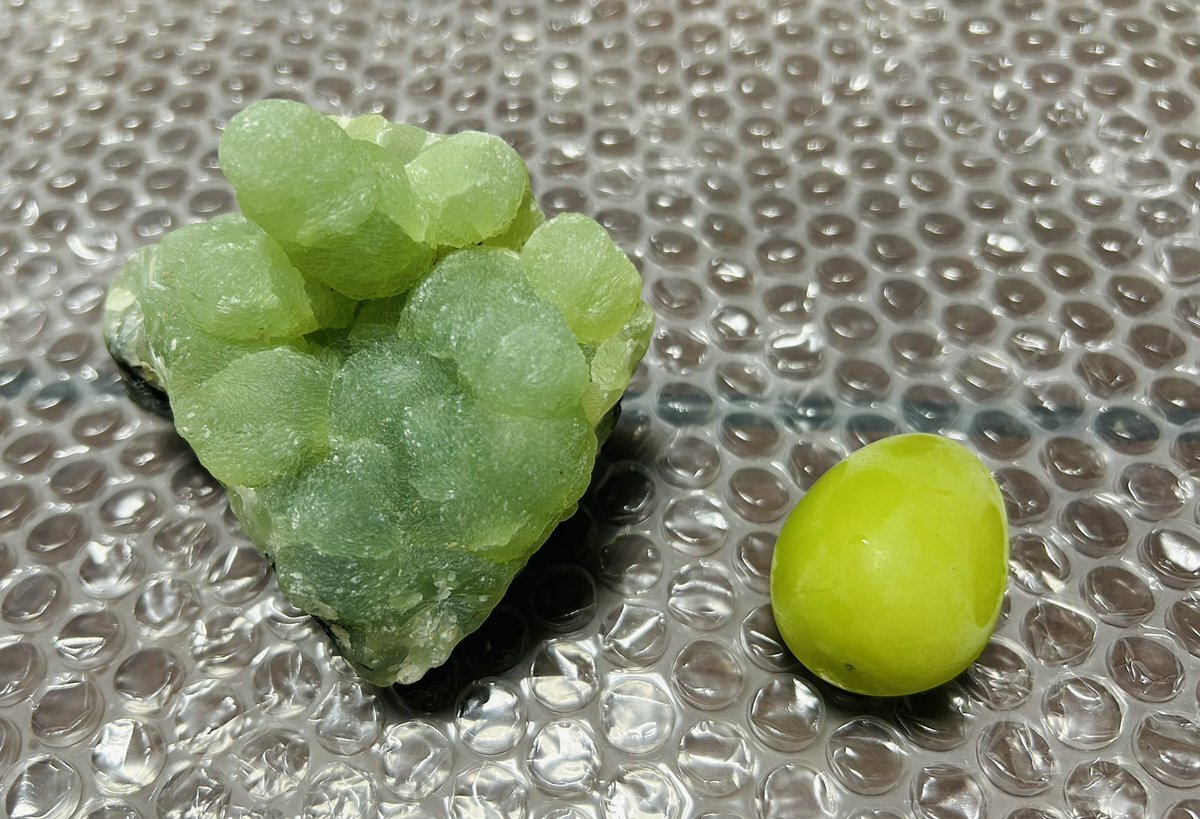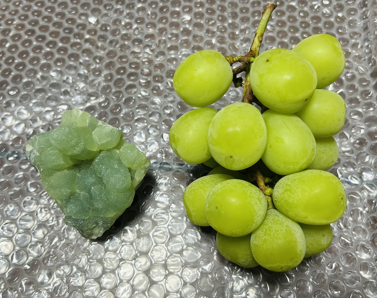 最近届いたモコモコプレナイト! 葡萄の日に届かなかったので遅いですが今日お披露目(((´ω` *)(* ´ω`))) 葡萄石という和名なので、シャインマスカットとサイズ比較撮影してみましたw 葡萄石(プレナイト)、&1粒、&🍇 #鉱物 #プレナイト #葡萄石 pic.x.com/brDJdxZ9Ku