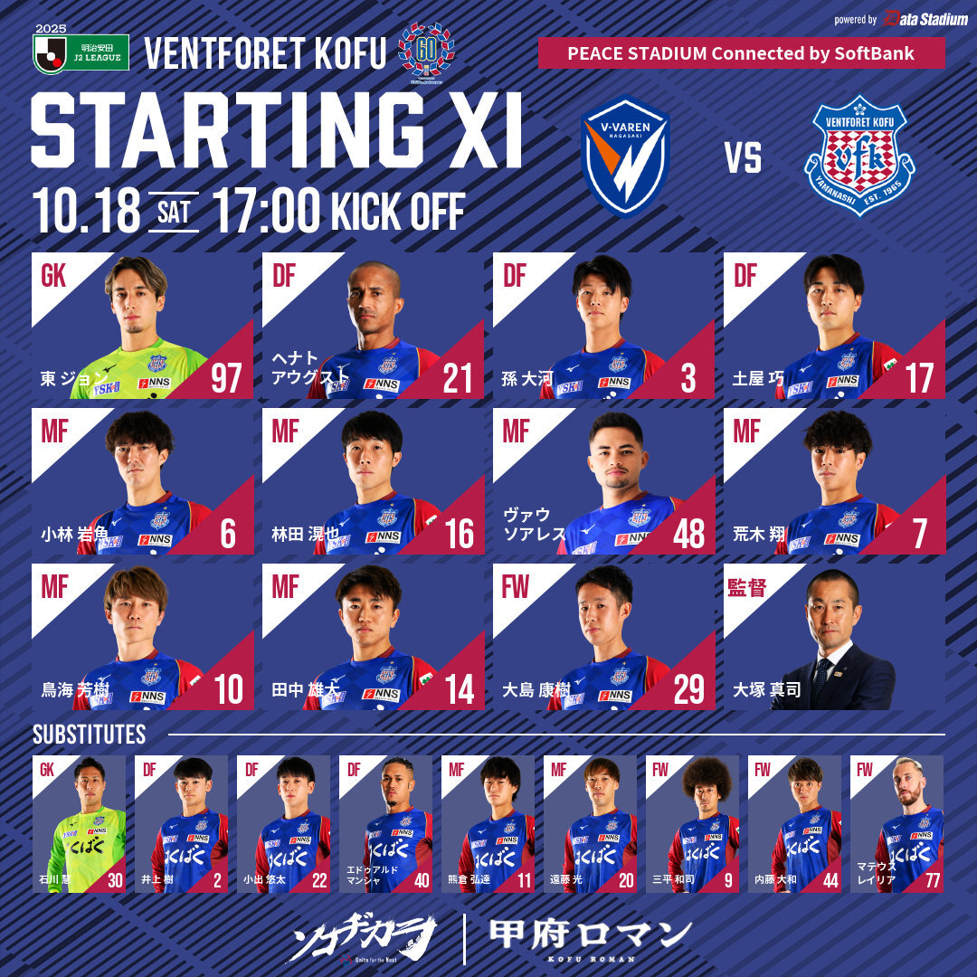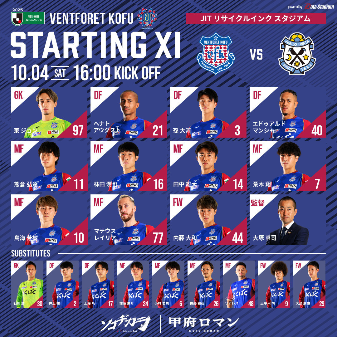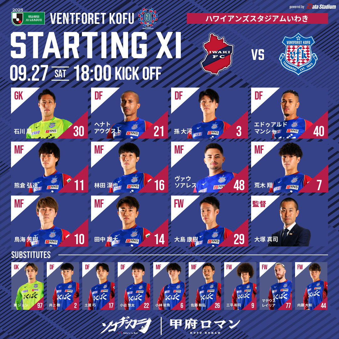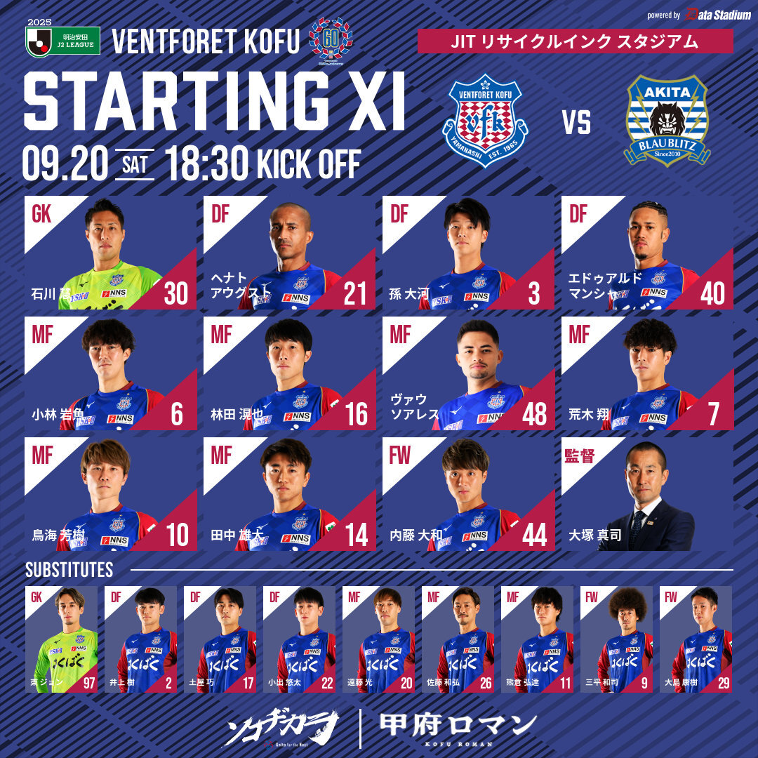 明治安田J2リーグ 第30節 #ヴァンフォーレ甲府 🆚 #ブラウブリッツ秋田 スタメン発表🔥 GK #石川慧 DF #ヘナトアウグスト #孫大河 #エドゥアルドマンシャ MF #小林岩魚 #林田滉也 #ヴァウソアレス #荒木翔 #鳥海芳樹 #田中雄大 FW #内藤大和 #vfk #ソコヂカラ pic.x.com/H1aXCBdD3i