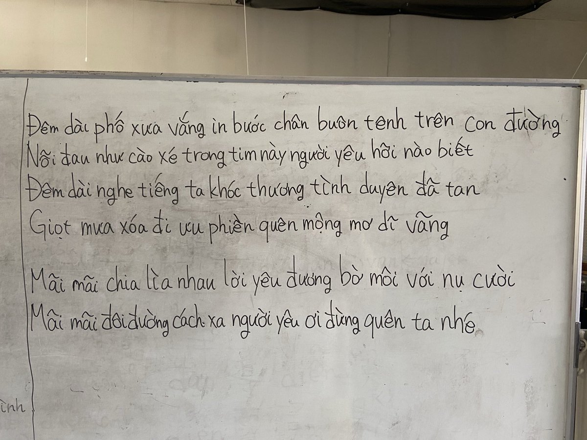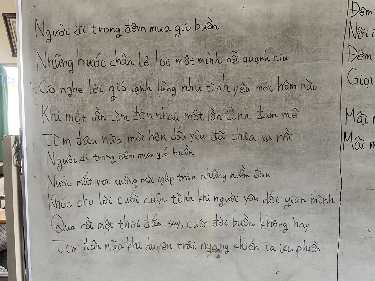 「外国語独習法」的に、ベトナム語の写経なう。ホワイトボード(汚すぎ)に大きく。ノート等とはまた違い、こんな風に大きく書くと、これはこれで何かの効果ある感じある。文章は中村雅俊「恋人も濡れる街角」のベトナム版の詞。 #ベトナム語界隈 #ベトナム語 #ベトナム #tiengviet #vietnam pic.x.com/QlzoZah3uR