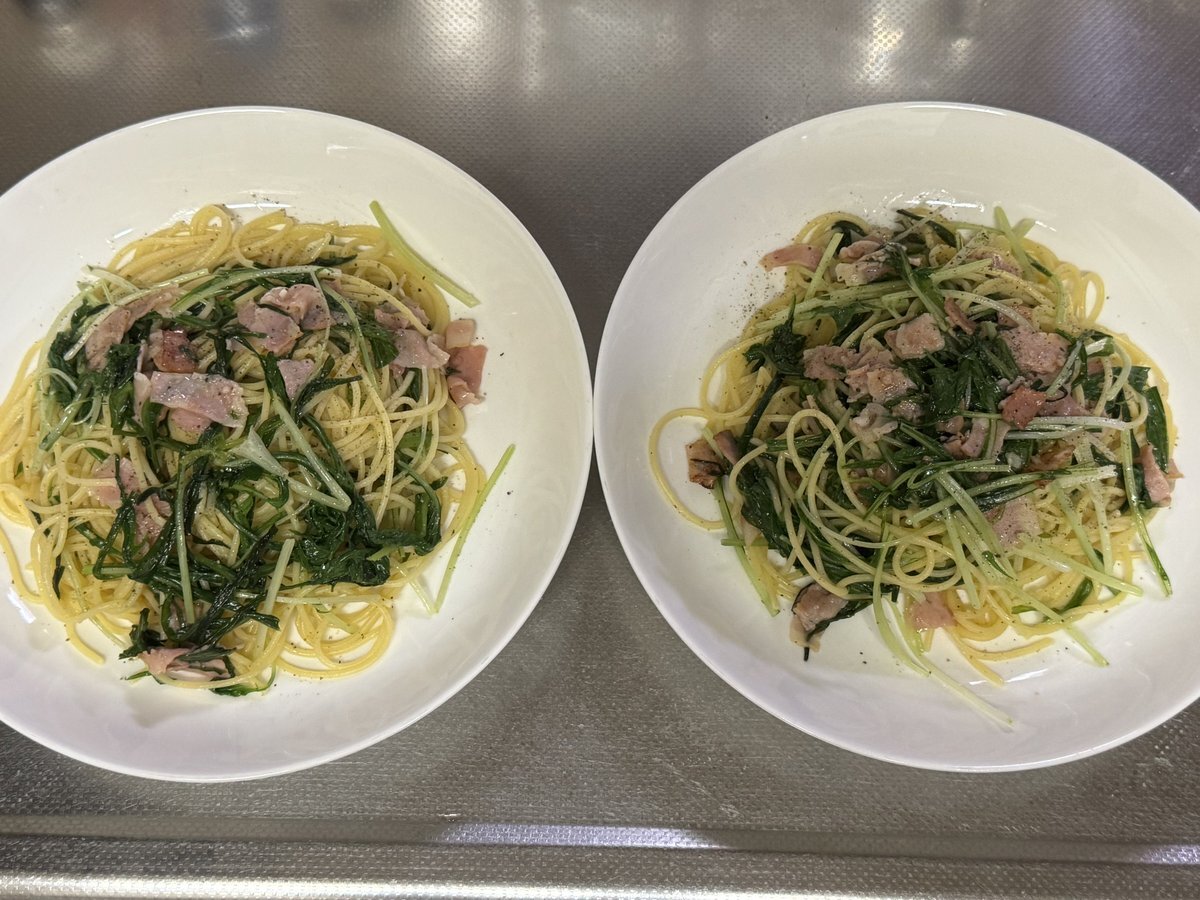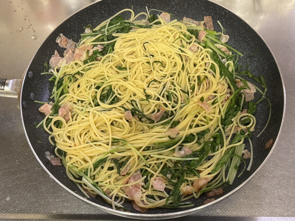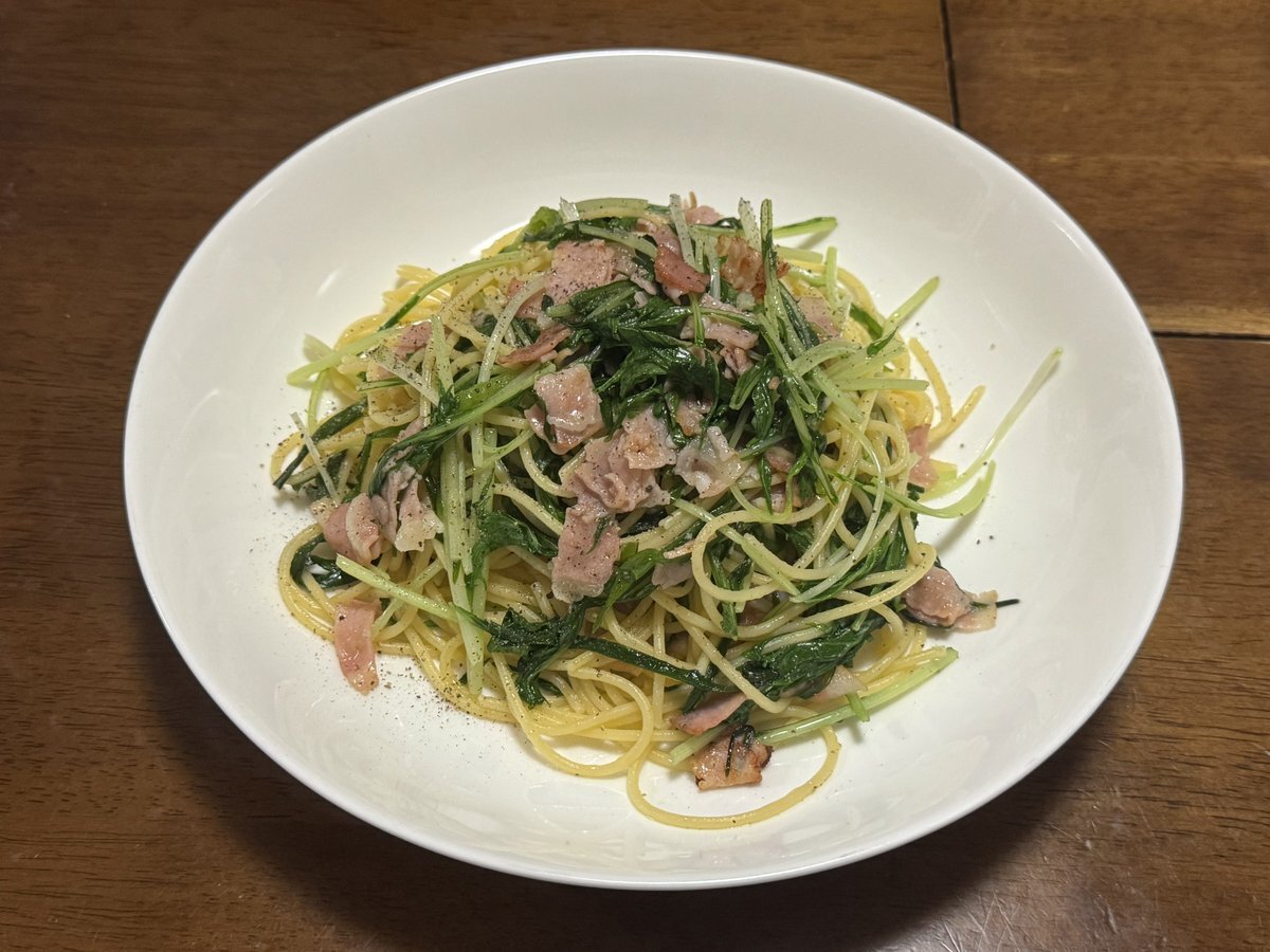 水菜とベーコンとニラの塩バタースパゲッティ。 #夕食 #水菜とベーコンとニラの塩バタースパゲッティ #ポポロスパ7分 #オリーブオイル #にんにくチューブ #ベーコン #ニラ #バター #水菜 #リュウジの至高の塩 #ブラックペッパー pic.x.com/YlACV9asQn