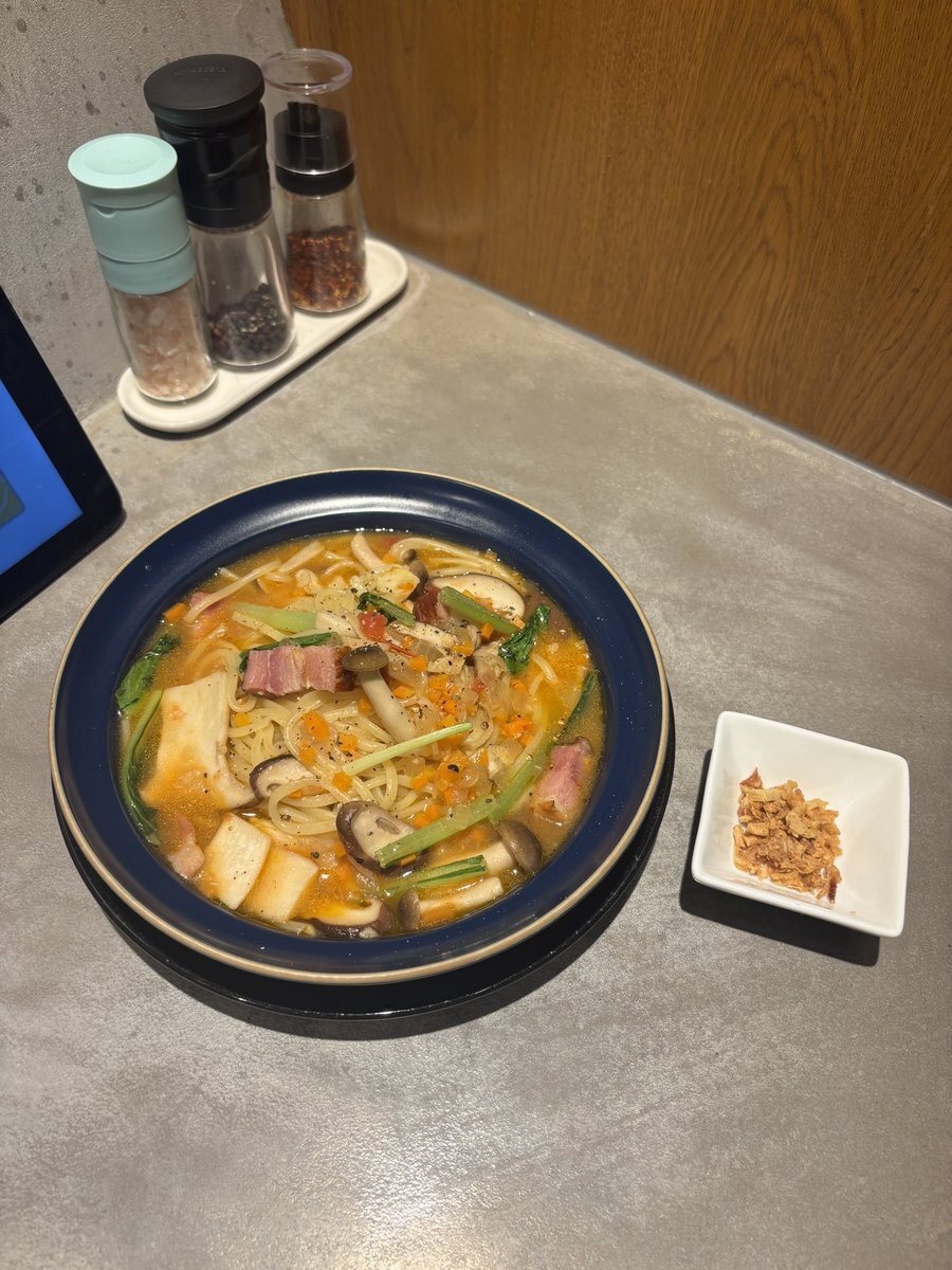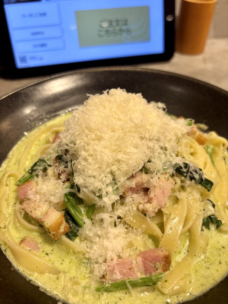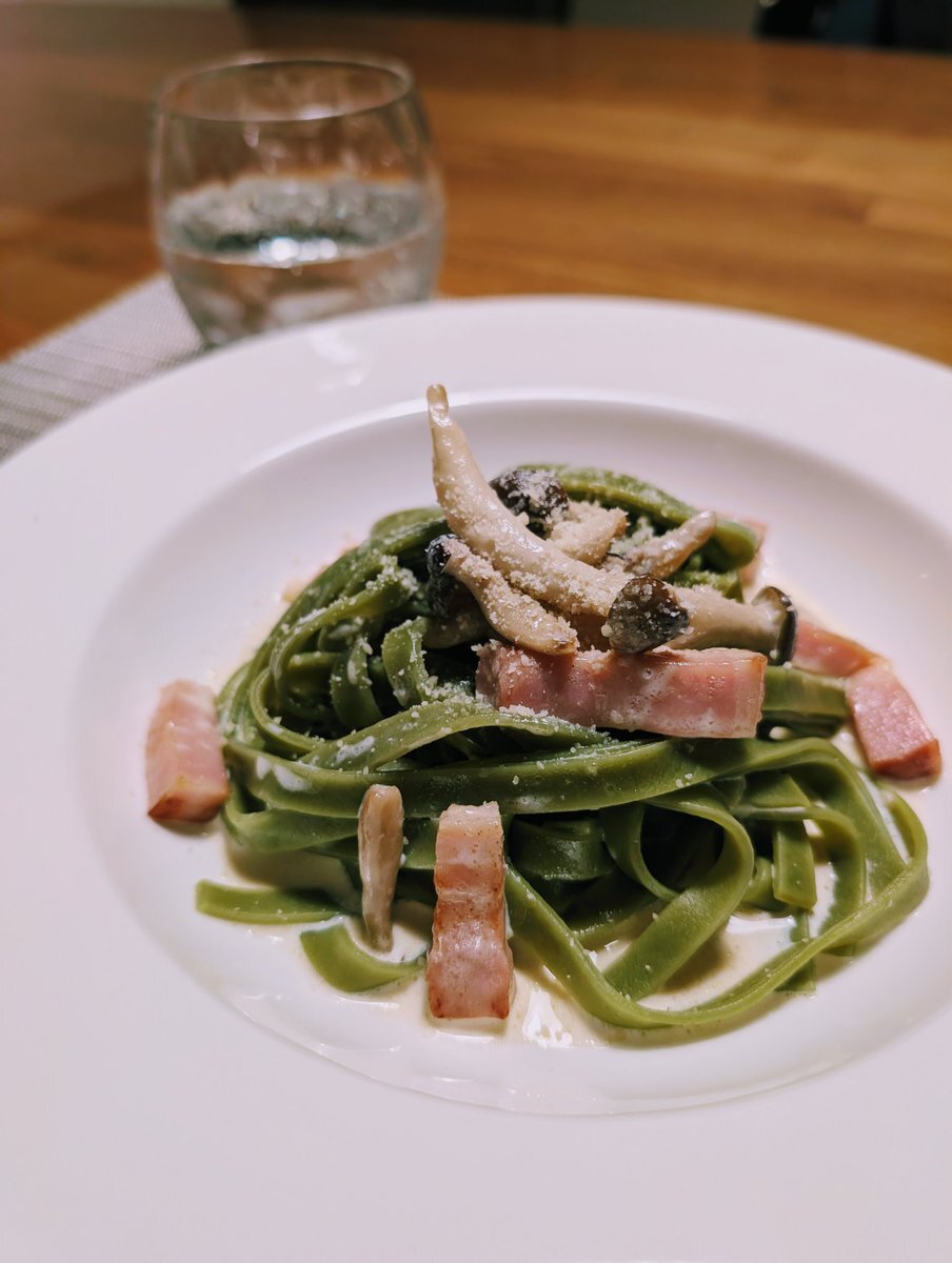 水菜とベーコンとニラの塩バタースパゲッティ。 #夕食 #水菜とベーコンとニラの塩バタースパゲッティ #ポポロスパ7分 #オリーブオイル #にんにくチューブ #ベーコン #ニラ #バター #水菜 #リュウジの至高の塩 #ブラックペッパー pic.x.com/YlACV9asQn