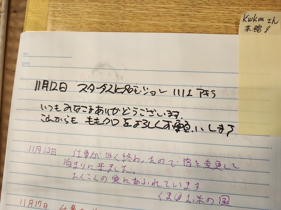 【ホテル黒部】2/4 ホテル黒部さんにはお忍びで川上さんが来てくださったり、ラジオ収録でれにちゃんとあーりんが来てくれて手書きのメッセージなんかも残っててマジ嬉しい。ありがとうございます! →3/4へ続く #ももクロ #春の一大事2019 Day2403 #ホテル黒部 pic.x.com/51frADd8o8