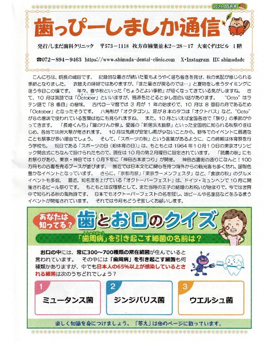 毎月1日に当院で発行し、来院された患者様にお渡ししている「歯っぴーしましか通信」です。 一部ですがどうぞご覧下さい! #枚方 #楠葉 #樟葉 #くずは #歯科 #歯科矯正 #新聞 # #歯並び #ホワイトニング #小児歯科 #小児矯正 #口腔外科 # #スポーツの秋 #スポーツの日 #地ビール #名産品 pic.x.com/qa0vaM9M8F