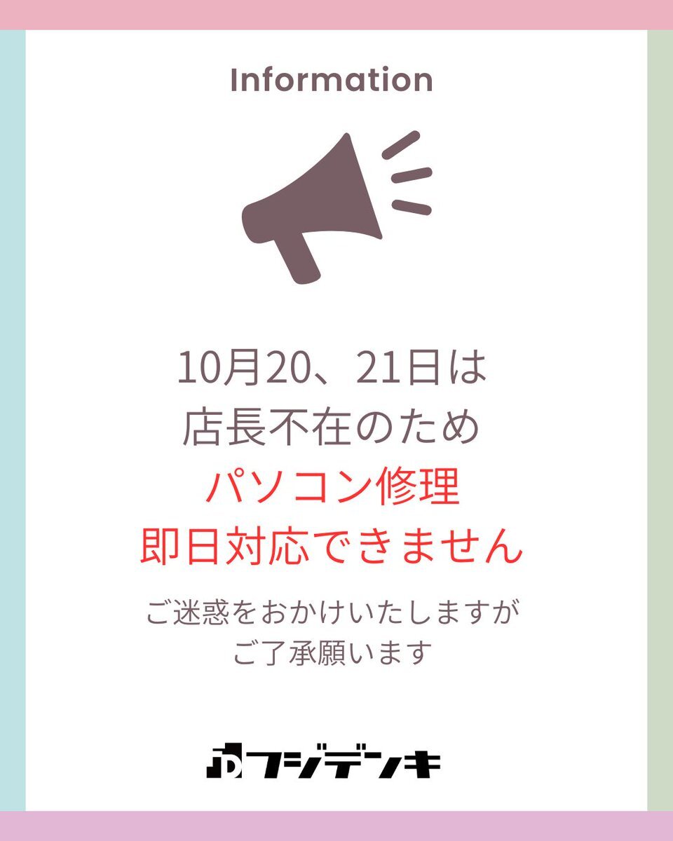 10月20、21日は店長不在のためパソコン修理即 日対応はできません ご迷惑をおかけいたしますが、ご了承願います fujidenki.org #フジデンキ #パソコン修理 #ホームページ制作 #三春町 #郡山市 #田村市 pic.x.com/Tw03XHgT0T