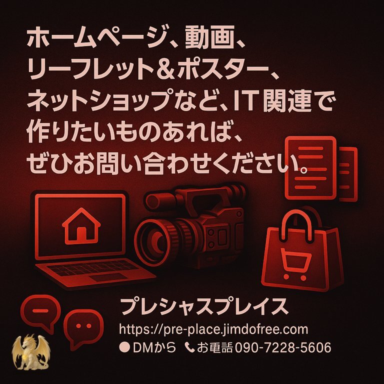 ホームページ、動画、リーフレット&ポスター、ネットショップなど、IT関連で作りたいものあれば、ぜひお問い合わせください「プレシャスプレイス」pre-place.jimdofree.com から DMから お電話090-7228-5606 からお問合せください。#動画制作 #MV制作 #SNS運用 #ホームページ制作 #チラシデザイン pic.x.com/7z86X8hEx5