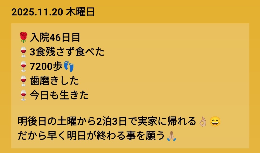 #ホメ療法 #みんなdeポジティブ人間化 #ポジティブ日記 #3goodthings #双極症 #HN倶楽部 🌹入院46日目 🍷3食残さず食べた 🍷7200歩👣 🍷歯磨きした 🍷今日も生きた 明後日の土曜から2泊3日で実家に帰れる👌🏼😄 だから早く明日が終わる事を願う🙏🏼 pic.x.com/ZVHlStoE1U