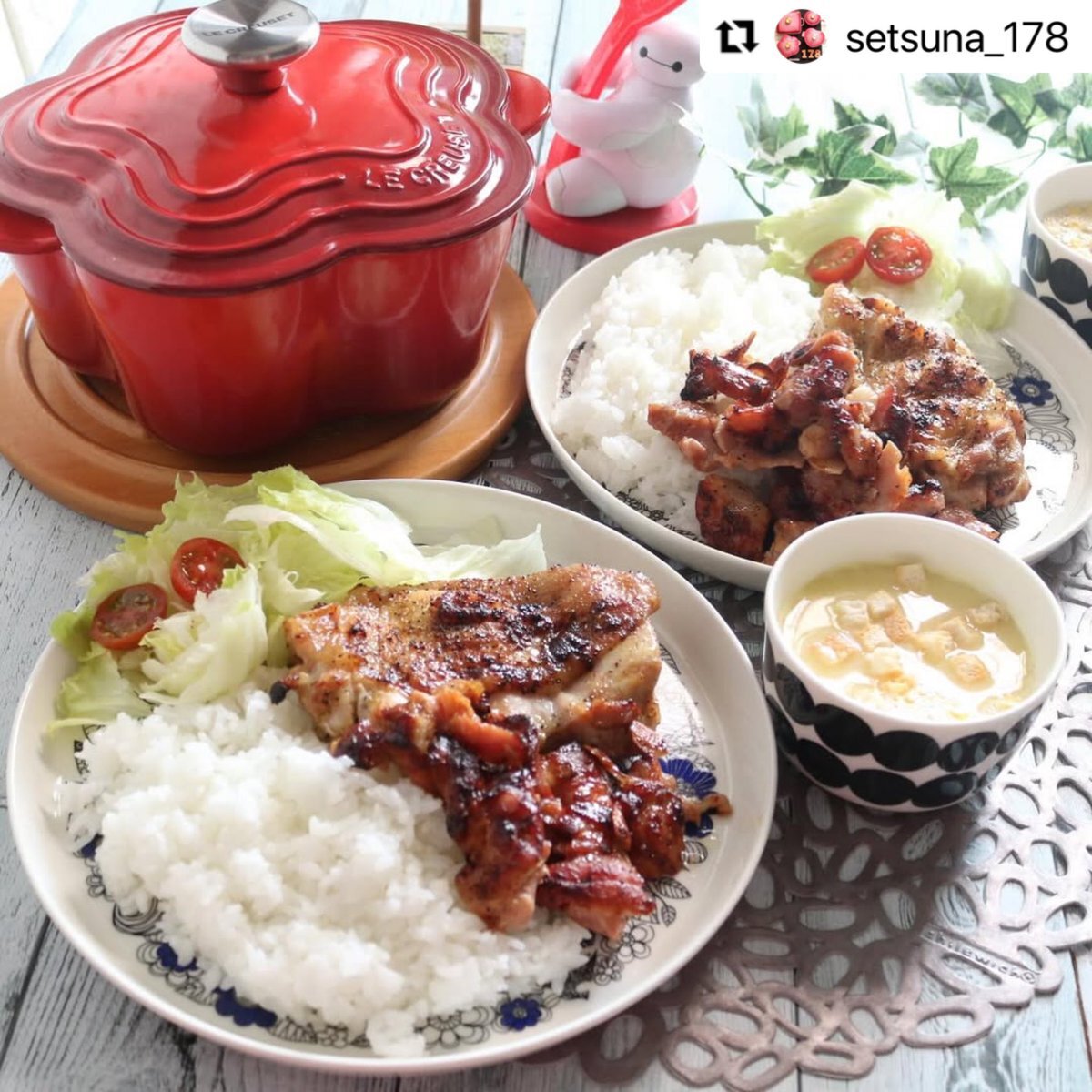 こんばんはー! 今朝のインスタ / ガーリックとレモンペッパーの グリルチキン2種 \ 盛り付けてこんなに素敵に💓 お米は岩崎農園きたくりん アンバサダー様のお料理です😊 #ルクレーゼ #マリメッコ instagram.com/iwasaki_farm_a… #企業公式がお疲れ様を言い合う pic.x.com/YqjPAiuxU7