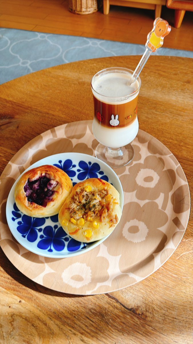 今日休みだったのでお昼用にパン焼いた。 ブルーベリークリームチーズパンとツナマヨコーンパン 美味しかった。 ハウステンボスで買ったミッフィー のグラス可愛い😍 #マリメッコ #ローストランドモナミ pic.x.com/GrAxQtNBMv