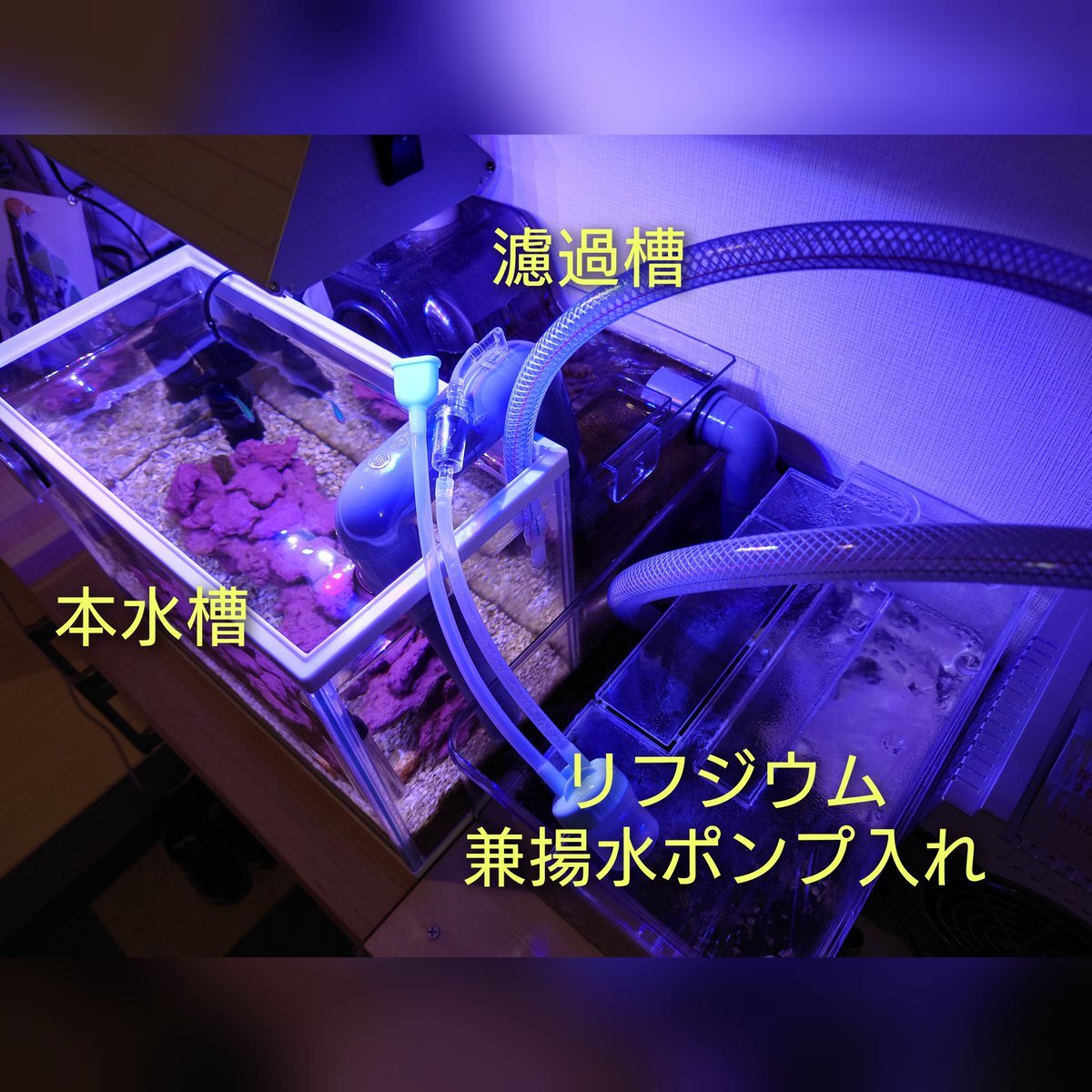 水槽内機械でいっぱい問題は100均の300円水槽と300円の透明収納ケースで濾過槽とリフジウムを作って解決!本水槽は濾過槽とのサイフォン管だけになってスッキリ。 #海水水槽 #マリンアクアリウム #小型水槽 pic.x.com/lIa4FzKE1S x.com/izayoi_tks/sta…