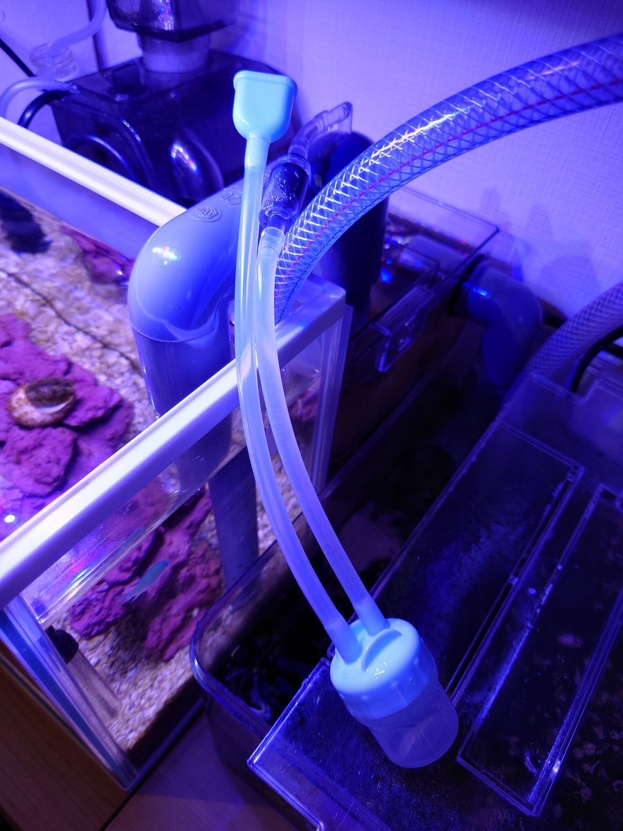 メイン水槽と濾過槽はサイフォンでつないでます。サイフォン切れたときと、溜まった空気抜くために空気抜き用のチューブから直接吸い出してたけど、毎回口に海水が……。You Tubeで赤ちゃんの鼻水吸い出すやつ使ってる人居て試してみたら快適だ。天才だわ。 #海水水槽 #マリンアクアリウム pic.x.com/mQ5eHVfMvM