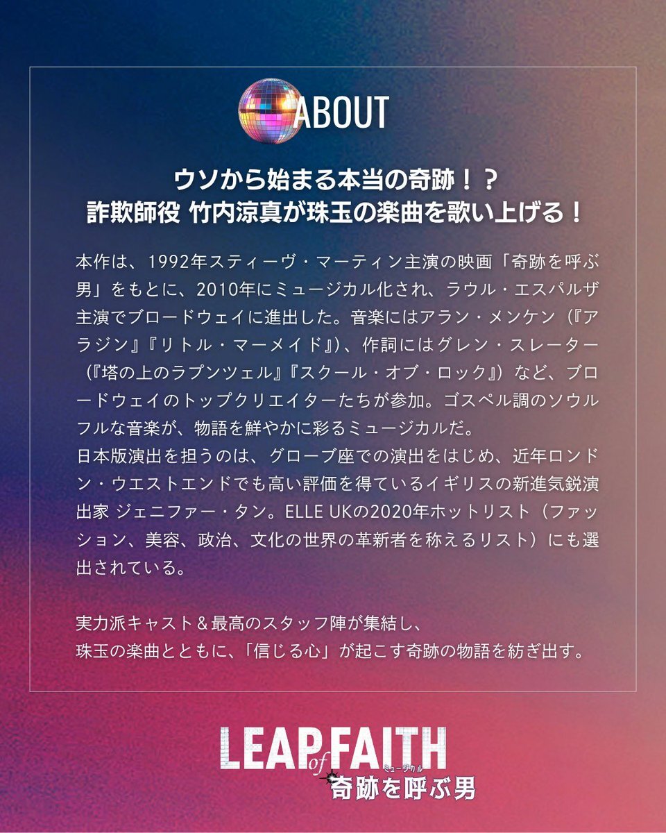 ✦・✦ #奇跡を呼ぶ男ミュージカル 𝘼𝘽𝙊𝙐𝙏&𝙎𝙏𝙊𝙍𝙔 ✦・✦ 🪩ウソから始まる本当の奇跡 詐欺師役 #竹内涼真 が珠玉の楽曲を歌い上げる! 音楽:アラン・メンケン 脚本:ジャナス・サーコーン、ウォーレン・ライト 作詞:グレン・スレーター 演出:ジェニファー・タン horipro-stage.jp/stage/leapoffa…