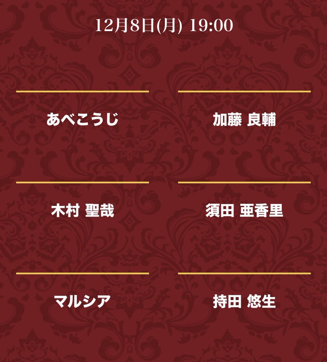 ◤ ̄ ̄ ̄ ̄ ̄ ̄ ̄ ̄ チケット先行受付中 ________◢ ✰12月8日(月) 19:00公演✰  ̄ ̄ ̄ ̄ ̄ ̄ ̄ ̄ ̄ ̄ ̄ ̄ #あべこうじ #加藤良輔 #木村聖哉 #須田亜香里 #マルシア #持田悠生 #髙木俊 #川瀬莉子 🔽11月24日23:59まで🎫 spwn.jp/events/evt_biS… #マーダーミステリーシアター #偽りの晩餐 pic.x.com/QnwZUt2g4v
