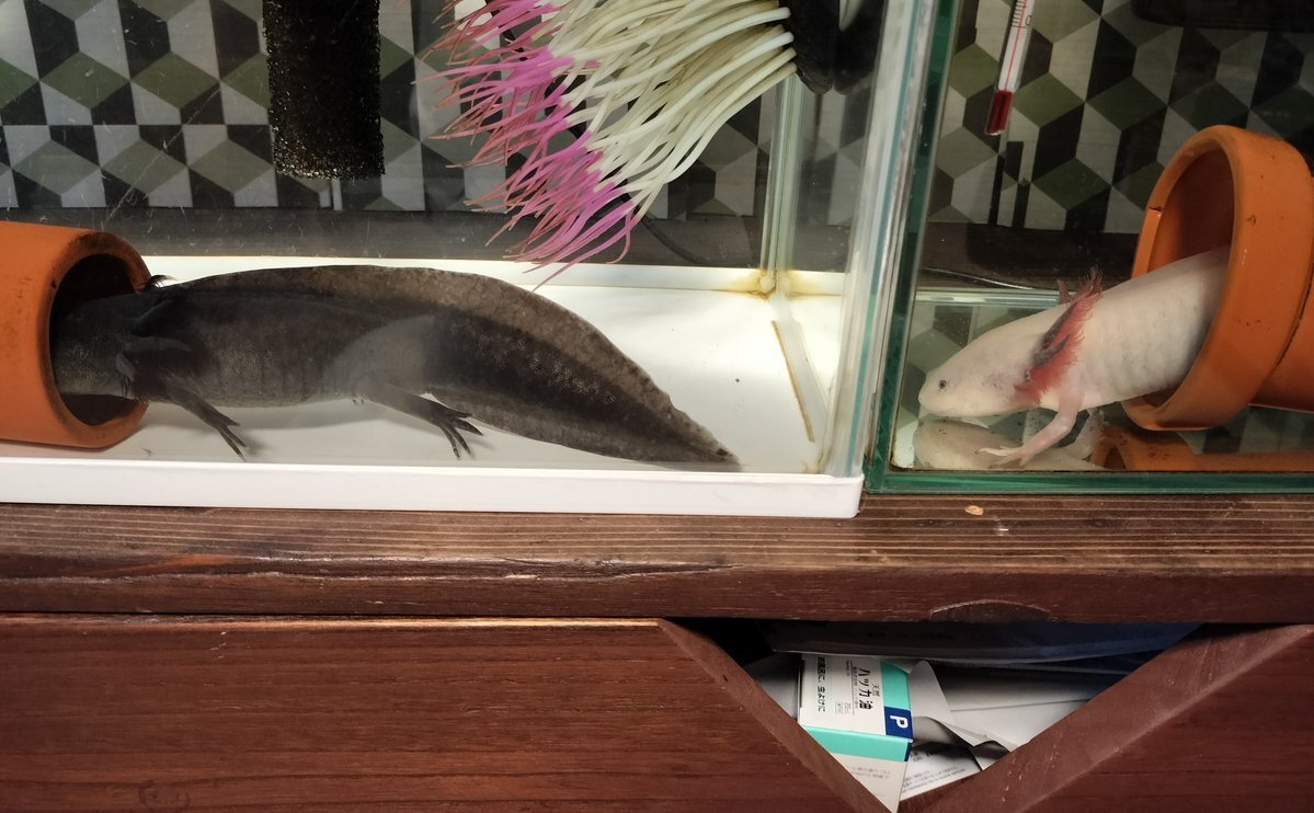 うぱもおたまも大きくなったなぁ〜… 土管の窓から出ているうぱさんの足は大丈夫なのか しかし観る度にあなた達の手の指はなんで4本で、足の指は5本なの?っていまだになっちゃう。ふしぎ。 #ウーパールーパー #リューシスティック #マーブル #アホロートル pic.x.com/hSjkrzrSdi