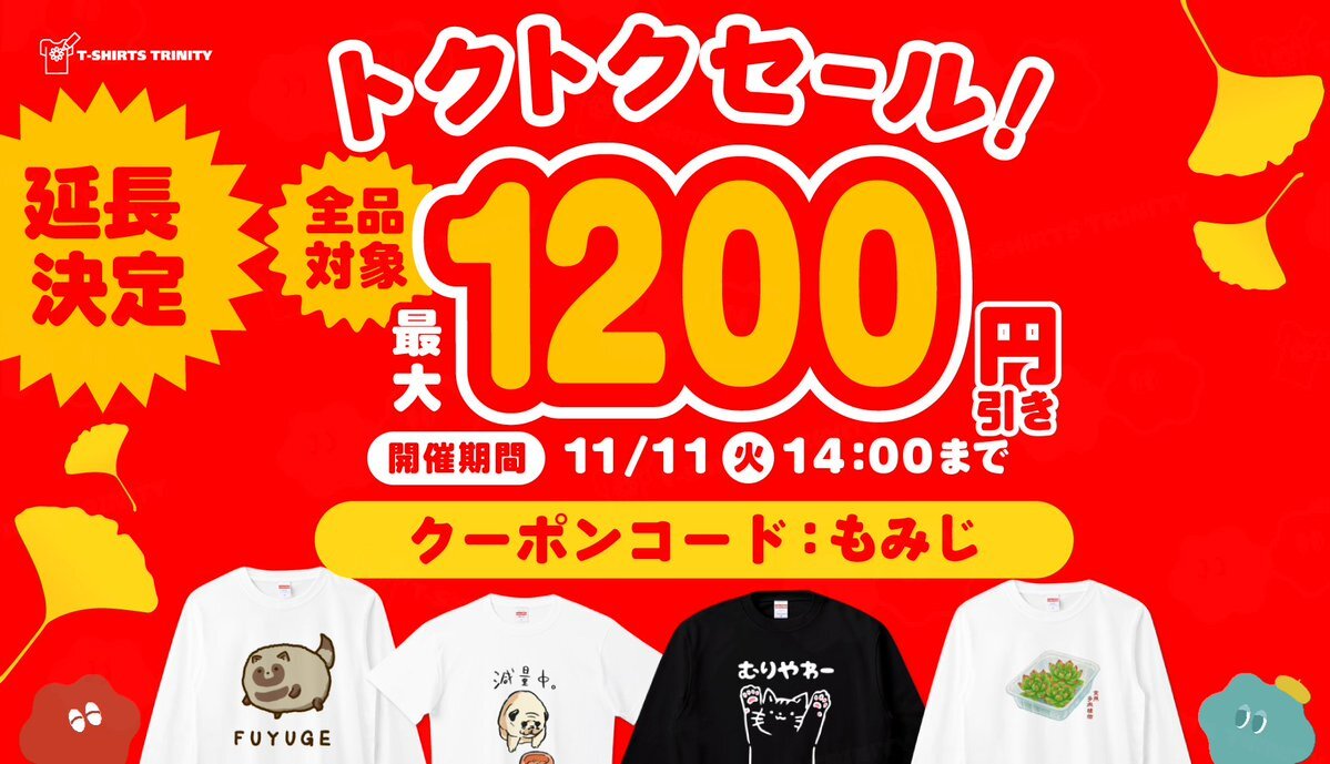 >>ご好評につき延長決定‼️<< \最大1,200円引き❗️全品対象トクトクセール‼️/ 人気の半袖Tシャツや、ロンT・パーカーなど、秋冬アイテムがとってもおトク⭐️ このチャンスをお見逃しなく😍🔥 🎫400円引きクーポン配信 クーポンコード:もみじ 詳細はコメント欄から👇