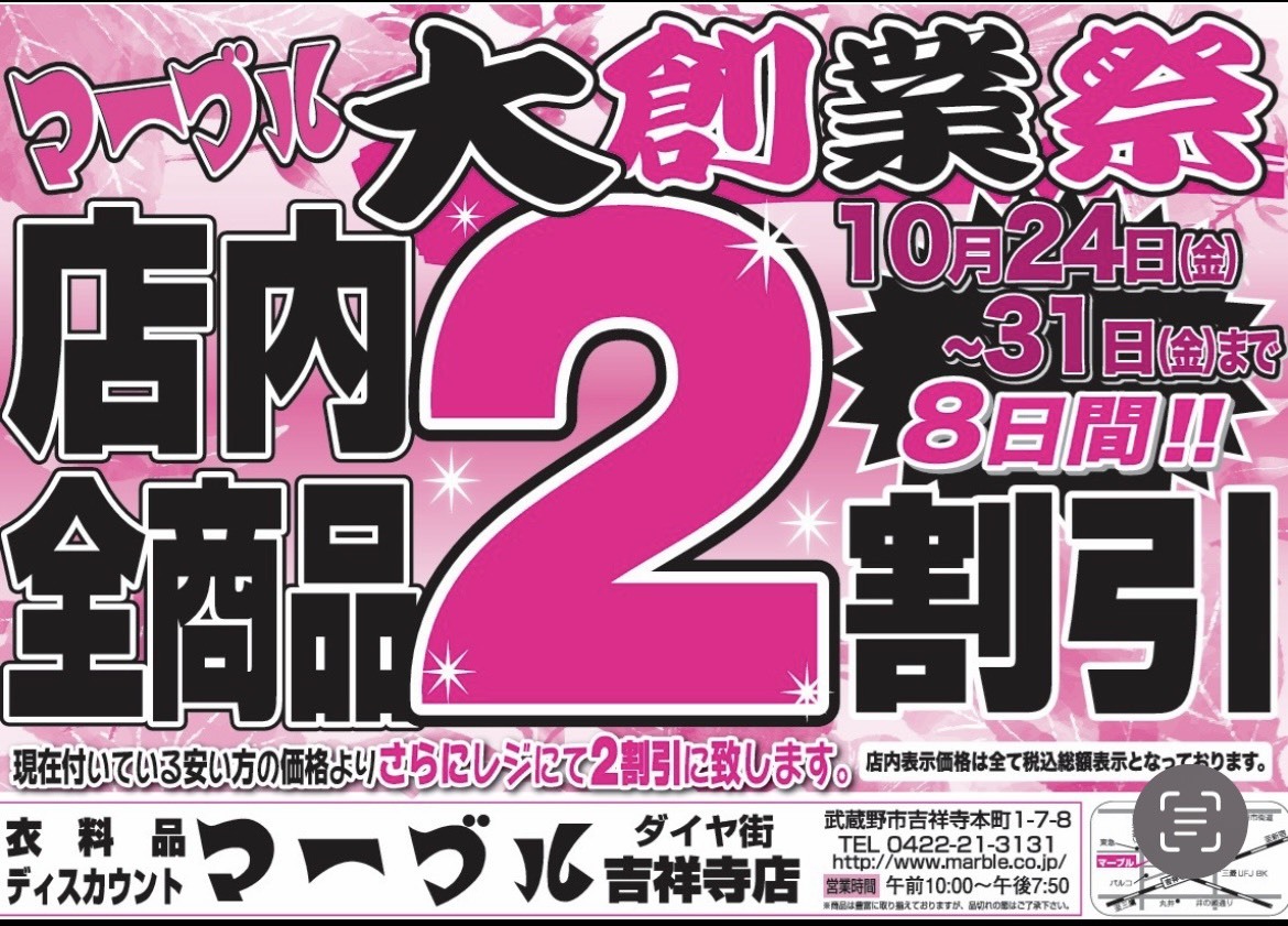 おはようございます🌞 本日より『マーブル創業祭』が始まります!!店頭店内『全品』が『レジ』で【2割引き】となります!!!! 日替わり超特価もあるのでぜひご来店くださいね✨ #マーブル #マーブル吉祥寺店 #10時開店 #創業祭 #全品二割引 #日替わり商品 #超特価 #国産ストレッチパンツ pic.x.com/AYQiylCOUt
