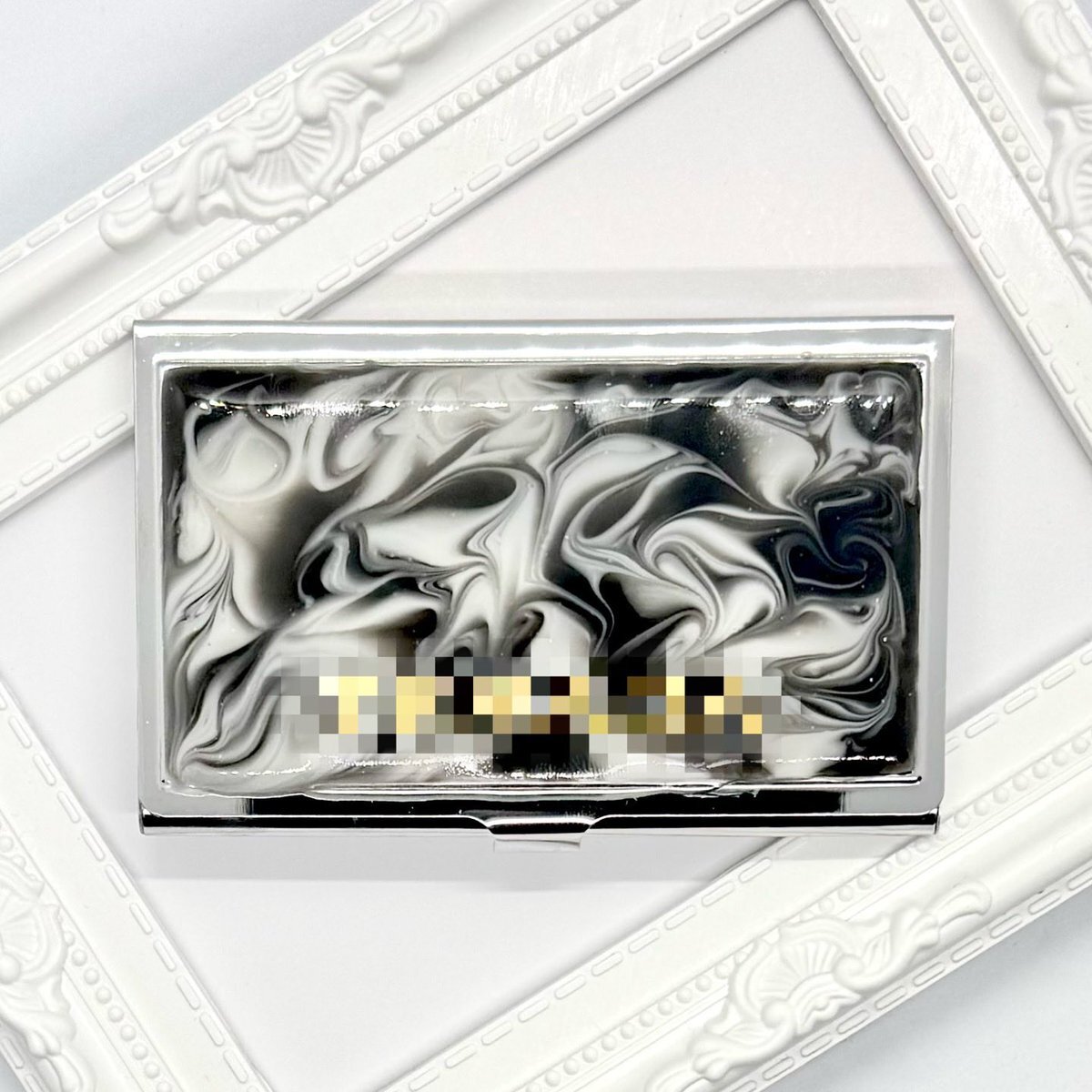 名刺入れ。 メンズが使うので白黒マーブル🤍🖤に、ゴールドの名入れ😊 ちょっとはみ出した💦 もっと薄く作らなきゃダメだね。 #こまりっこ #こまりっこさんと繋がりたい #レジン #ハンドメイド #名刺入れ #マーブル #レジン好きと繋がりたい pic.x.com/NC12EaMsuL