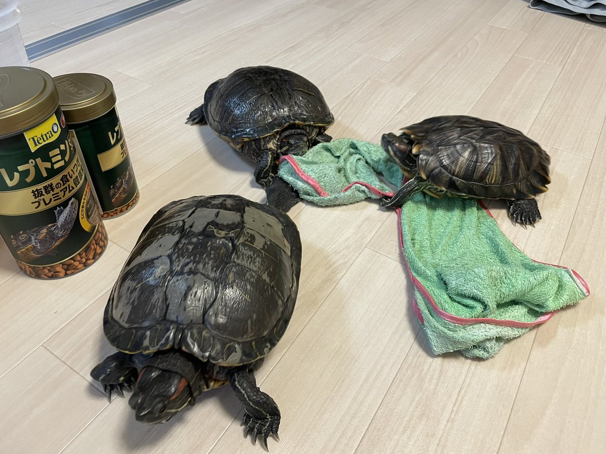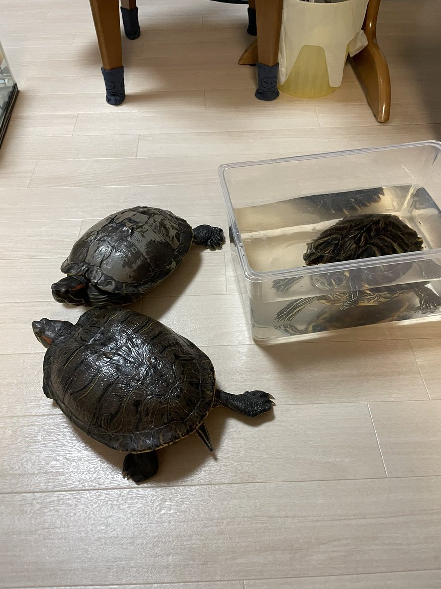 #亀 #カメ #かめ #クサガメ #ミシシッピアカミミガメ #ミドリガメ 3匹の亀の水替え完了。クサガメのフォルテ♂。ミシシッピアカミミガメのモンブラン♀、ガメラ♀。 pic.x.com/DPzSJZZJVF