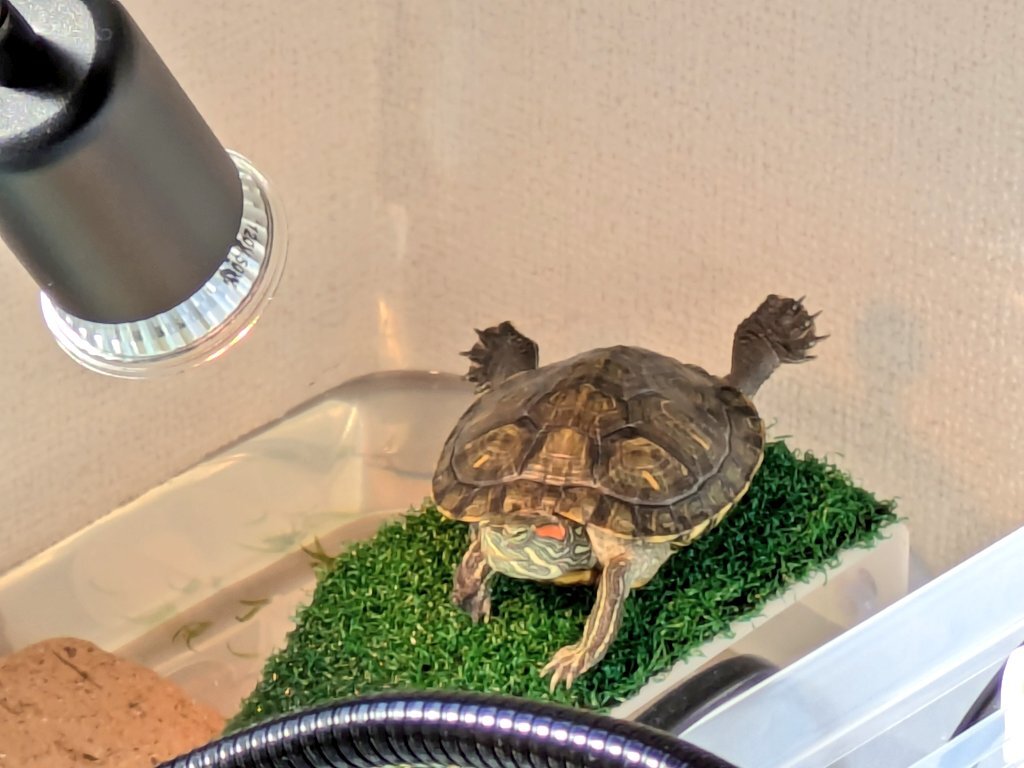 これはひなたぼっこしようねと お外に出されて 日が落ちてきたのに そのまま忘れられて 寒くなって怒っている亀です 鼻息が荒いからか 鼻に水泡がついてます #ミドリガメ #今日のカメ pic.x.com/WoYs94RiVi