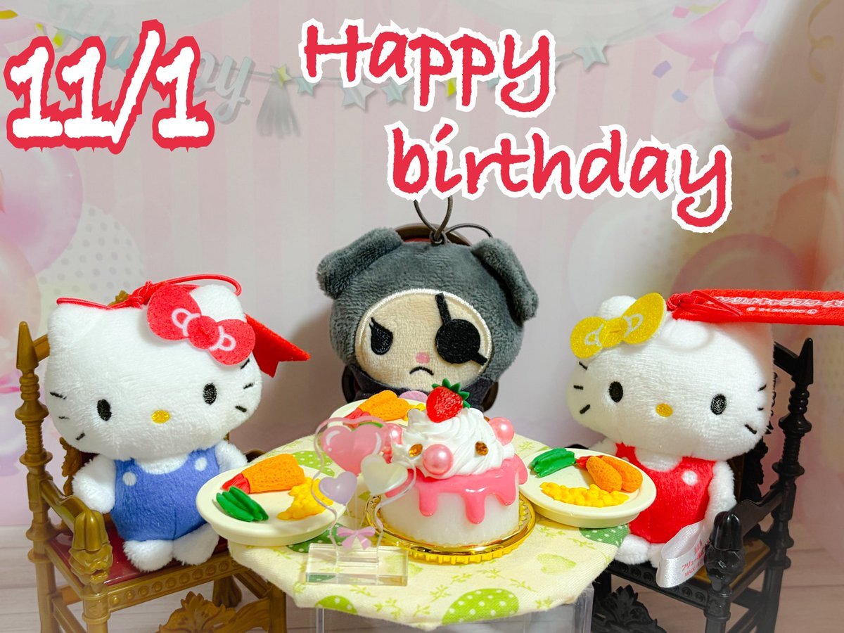 11月1日は #キティちゃん #ミミィちゃん #ワンミちゃん の誕生日🎈 友達が(引用ポスト)ケーキとご馳走でお祝いしてくれたよ🎂 キティちゃん、ミミィちゃん、ワンミちゃん、誕生日おめでとう🎉 #ハローキティ生誕祭 #ハローミミィ生誕祭 #ワンミ生誕祭 #ぬい撮り pic.x.com/tJzc7nz8xr x.com/mi__a_e__mi/st…