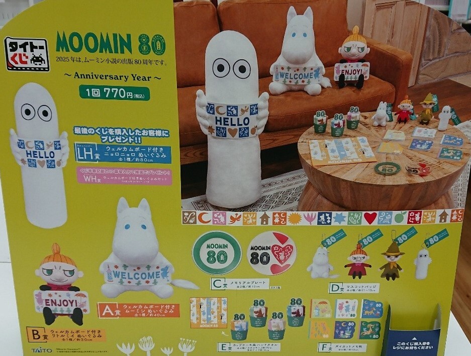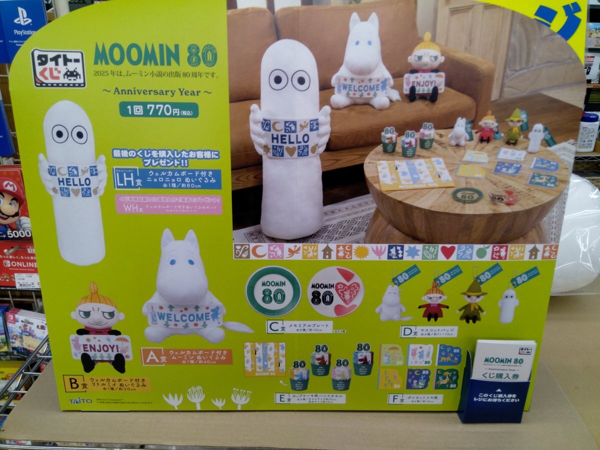 11月21日(金)発売開始!! ムーミン80周年を記念した「タイトーくじ ムーミン Anniversary Year」 LH(ラストハッピー)賞は大きくてかわいい!80cmあるニョロニョロのぬいぐみです☺️ ぜひご来店下さいませ🙇 #タイトーくじ #ムーミン #MOOMIN x.com/taito_kuji/sta…