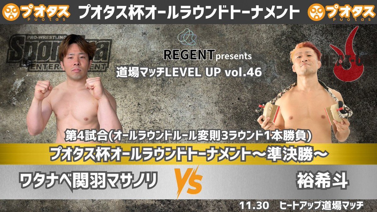 📣11月30日(日) 道場マッチ 決定分対戦カード🔥 #プオタス 杯オールラウンドトーナメント~順決勝~ オールラウンドルール(変則3R/1本勝負) ワタナベ関羽マサノリ vs 裕希斗 #heatuppw #若鯱プロレス REGENT presents 【HEAT-UP 道場マッチ LEVEL UP vol.46】 11月30日(日) 開場16:50/開始17:00