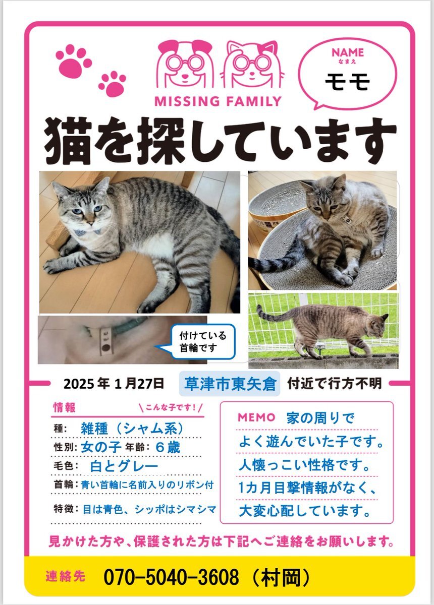 #拡散希望 #迷子猫 #滋賀県 #シャム系 #雑種 #メス #白 #グレー #ぽっちゃり #7歳 #草津市 #モモ 1日でも早く家族の元へ帰れますように🙏 首輪に名前と連絡先が書いてあるとのことです たとえ首輪なしでも似た感じの子を見かけたら、ご一報くださいませ x.com/5YL4JwgjXW8178…