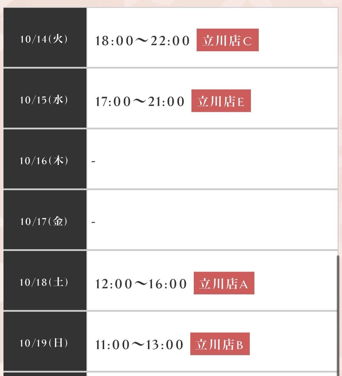 おはようございます!✨ 来週の出勤ですദ്ദി>ᴗ<)🎀✧ 事前予約も当日予約もお待ちしてますね♡♡ 10/31(金) 12:00~22:00 立川 11/1(土) 12:00~22:00 立川 11/2(日) 12:00~22:00 吉祥寺 #メンズエステ立川 #スプラッシュ立川吉祥寺 #メンズエステ吉祥寺 #メンエス #メンズエステ