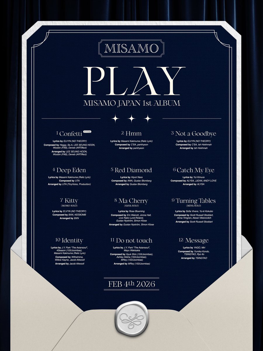 ✧ MISAMO JAPAN 1st ALBUM『PLAY』✧ ┈┈┈┈┈┈┈┈┈┈⿻*.· プログラム解禁 ⿻*.·┈┈┈┈┈┈┈┈ 2026.02.04 ALBUM RELEASE #MISAMO #MINA #SANA #MOMO #PLAY #MISAMO_PLAY #TRACKLIST