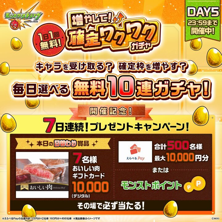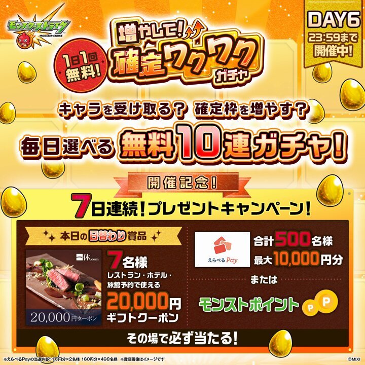 / 増やして!確定ワクワクガチャ開催記念 📢7日間連続CP✨6日目 \ えらべるPayや日替わり賞品🍖等が その場で当たる🎁 1️⃣本アカウントをフォロー 2️⃣ #確定ワクワクガチャもうすぐフィナーレ と「最終日に出て欲しいキャラ」をつけて引用ポスト(11/26迄) 3️⃣👇結果確認 gcp.giftee.biz/@monst_campaig…