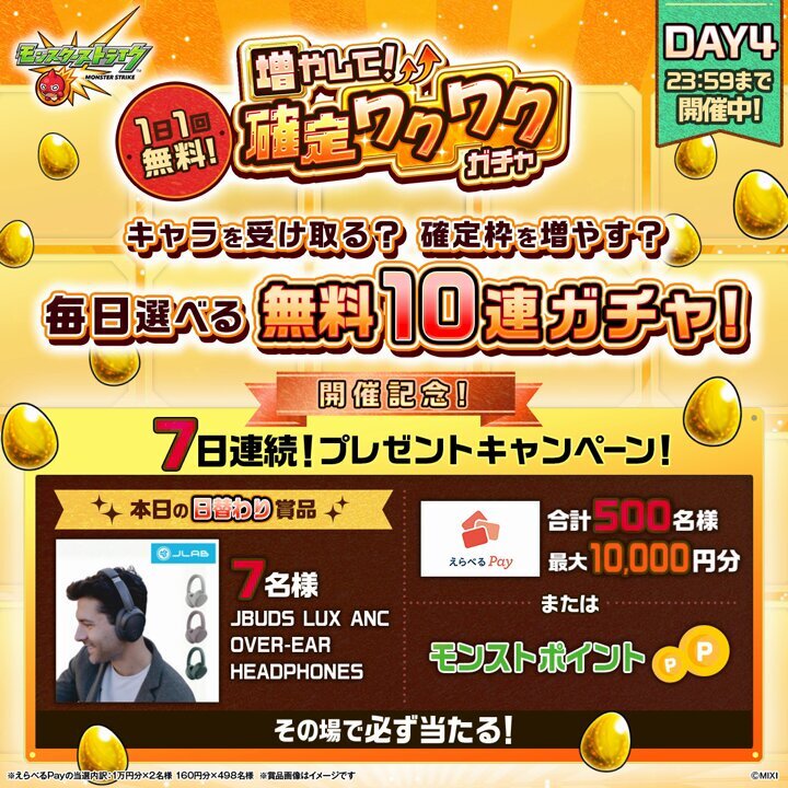 / 増やして!確定ワクワクガチャ開催記念 📢7日間連続CP✨4日目 \ えらべるPayや日替わり賞品🎧等が その場で当たる🎯 1️⃣本アカウントをフォロー 2️⃣ #確定ワクワクガチャ真ん中デー と「明日のガチャへの意気込み」をつけて引用ポスト(11/24迄) 3️⃣👇結果確認 gcp.giftee.biz/@monst_campaig… #モンスト
