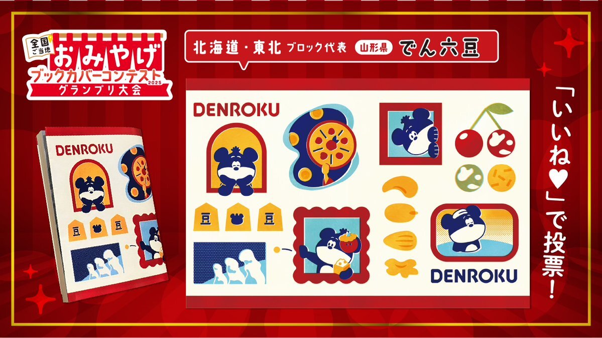 【山形県】でん六豆 北海道・東北ブロック代表としてグランプリ大会に参加できることを、とても光栄に思います✨ 当社のマスコットキャラクター「でんちゃん」と山形の魅力をぎゅっと詰め込んだブックカバーは、読書の秋にぴったり📕 皆様の「いいね♡」をお待ちしています! #おみやげブックカバーGP
