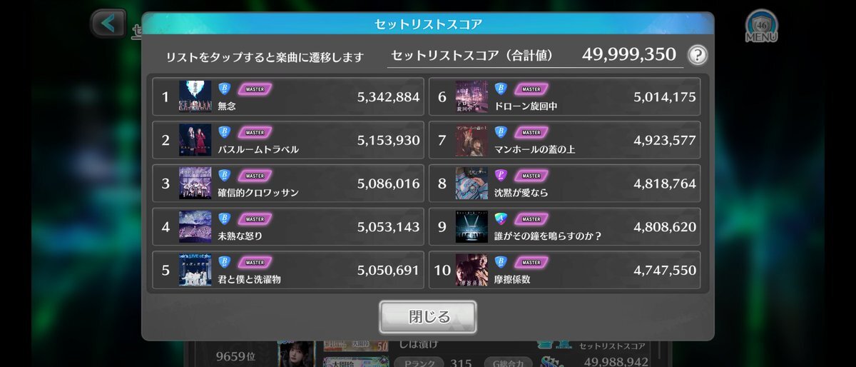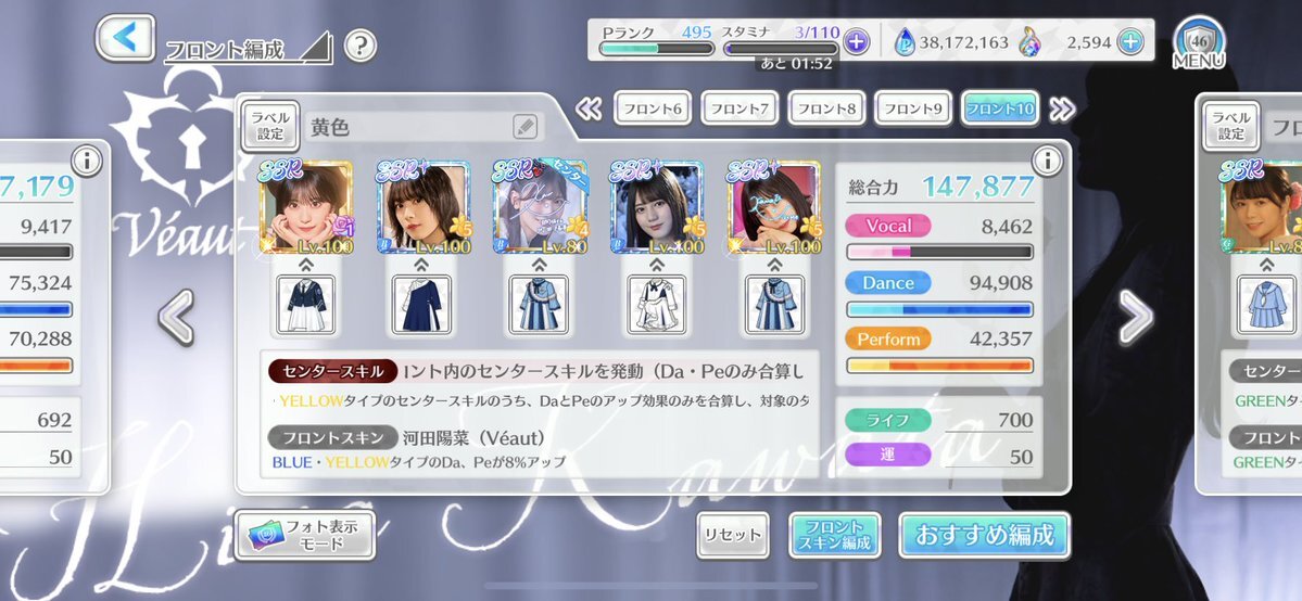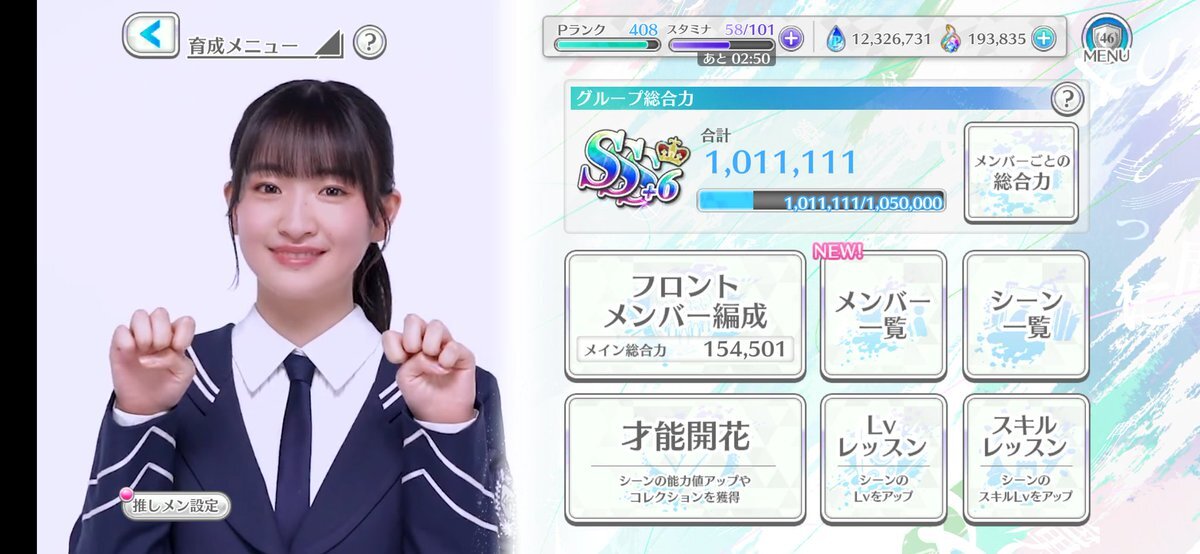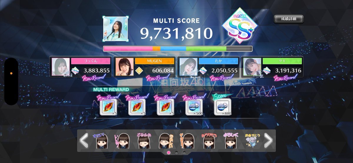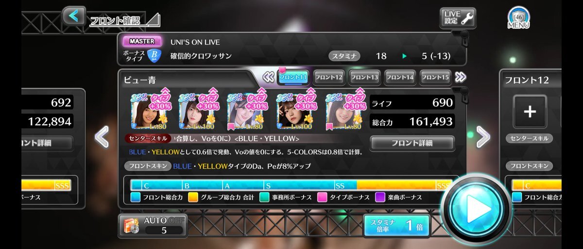 ビュー+T1を4人より河田さんの青でフリークボーナススキルが総合力上がったからこれで少しスコアタしたら400万セトリが上がってランキングも5000位も上がったけどdiamondまで上がるには更に1000万更新しないと入れないから明日まで無理だし諦めた😅 まだ伸びるけど続きはのんびりやります☆ #ユニエア pic.x.com/XC74P3JRQX