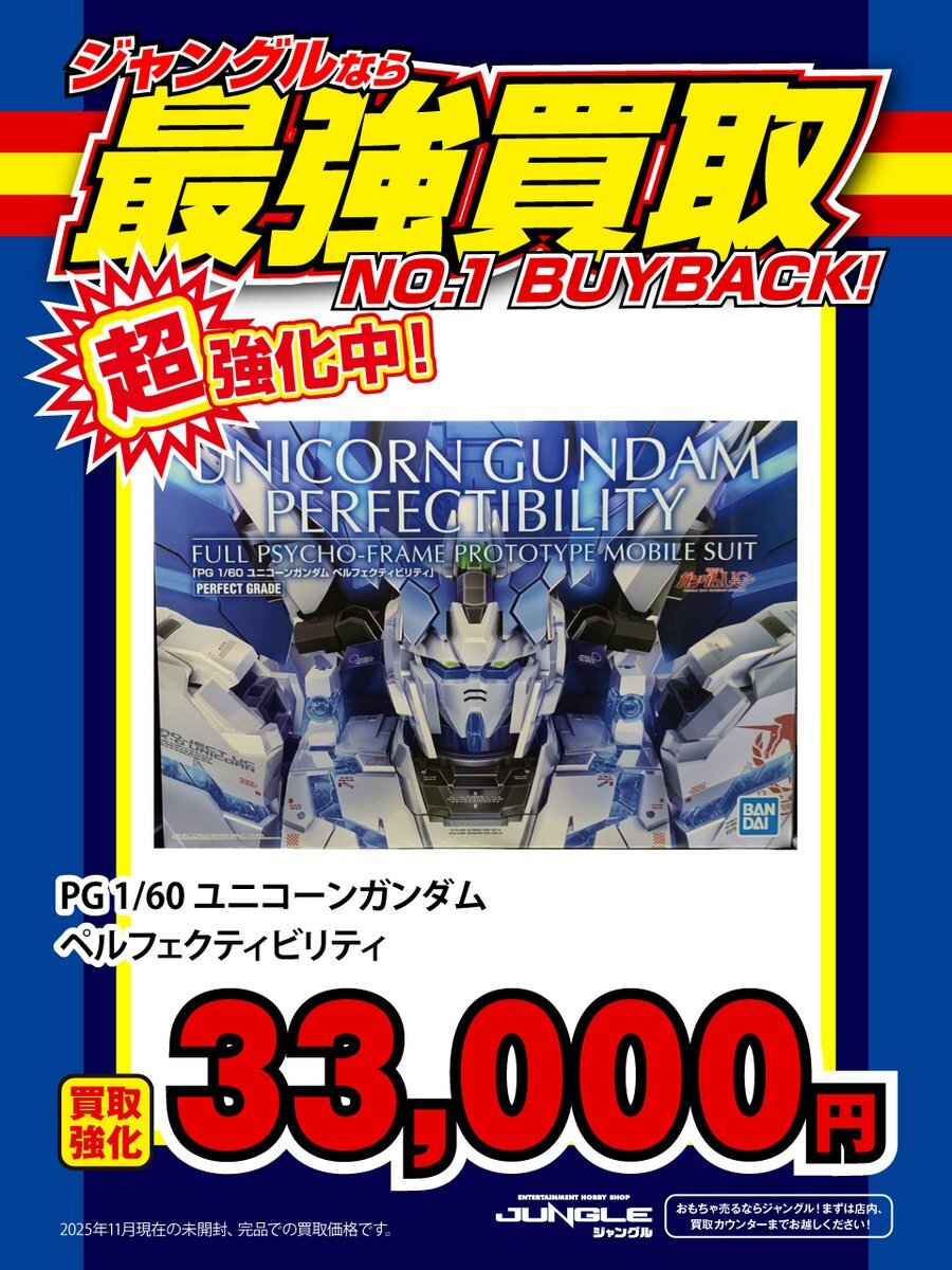 【#JUNGLE買取情報】 🔥買取強化実施中🔥 『PG 1/60 ユニコーンガンダム ペルフェクティビリティ』 【未開封】《¥33,000》 皆様のお持ち込みをお待ちしております‼ ※未開封品満額の買取価格になります。 買取金額は予告なく変更する場合がございます。 #ユニコーンガンダム スタッフ:七味 pic.x.com/WZycCnpiqm