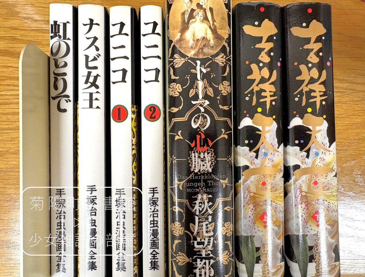 【新しく入った本】 手塚治虫「#虹のとりで」      「#ナスビ女王」     「#ユニコ」1~2巻(いずれも講談社) 萩尾望都「#トーマの心臓」(小学館) 吉田秋生「#吉祥天女」(小学館) 「虹のとりで」は『#なかよし』に掲載されていたものです。(手塚版アラビアンナイト!) pic.x.com/TaGxSPFYX0