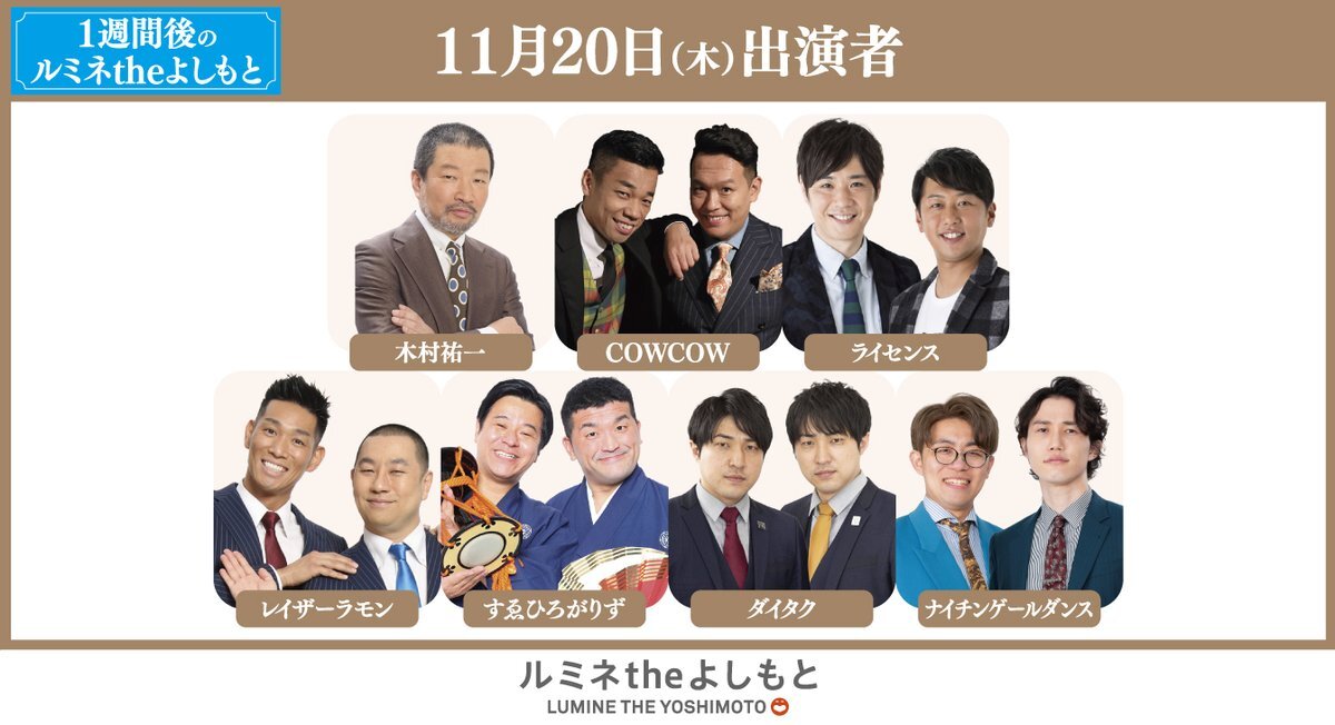 \1週間後のルミネtheよしもと🌟/ 11/20(木)の本公演 前売券販売中です🎟 出演者はこちら⬇️ #木村祐一/#COWCOW/#ライセンス/#レイザーラモン/#もりやすバンバンビガロ/#すゑひろがりず/#ダイタク/#ナイチンゲールダンス pic.x.com/Xm4ppLLjsc