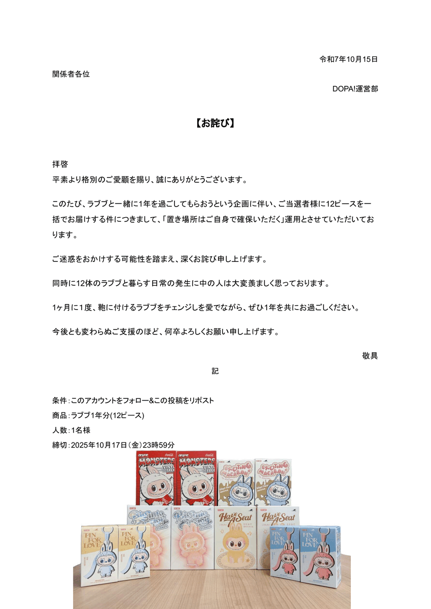 🎉年に1度のDOPA!の日Week 特別企画🎉 イニシャルラブブ を3ピースプレゼント🎁 ・参加条件 フォロー&リポストだけ!! ・応募〆切 10/13 16:59 ・当選確率アップ方法 @DOPA_hobby ラブブ 👆この2つをつけて引用リポスト💗 #ラブブ #LABUBU