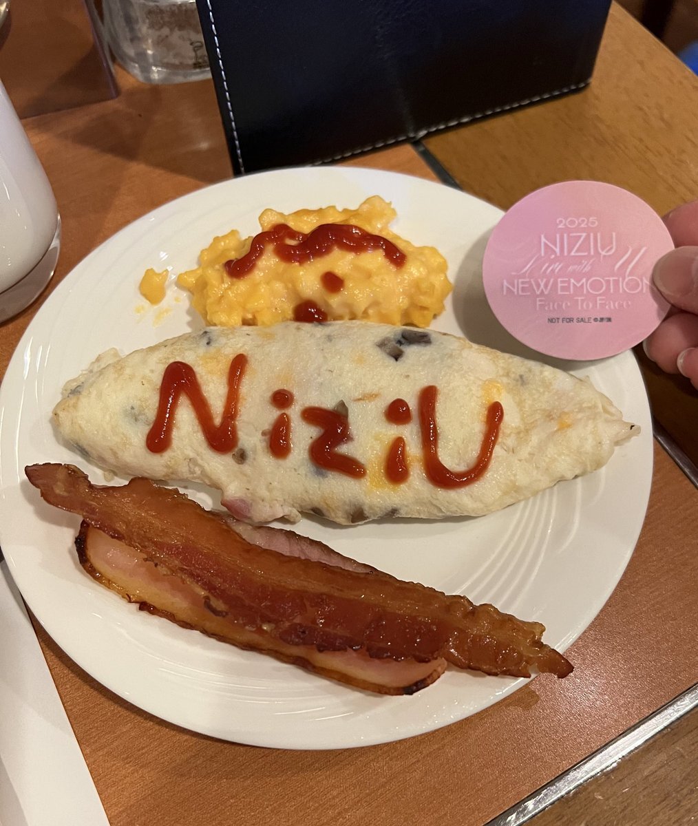 ホテルのモーニングビュッフェ🥚 リオちゃん、オムレツにNiziUって書いたよ🩵 スクランブルの雑なケチャップは気にしないで☺️笑 リオちゃんの朝ごはんは何かなぁ? #NiziU #リオちゃん pic.x.com/9qdBrXyJan