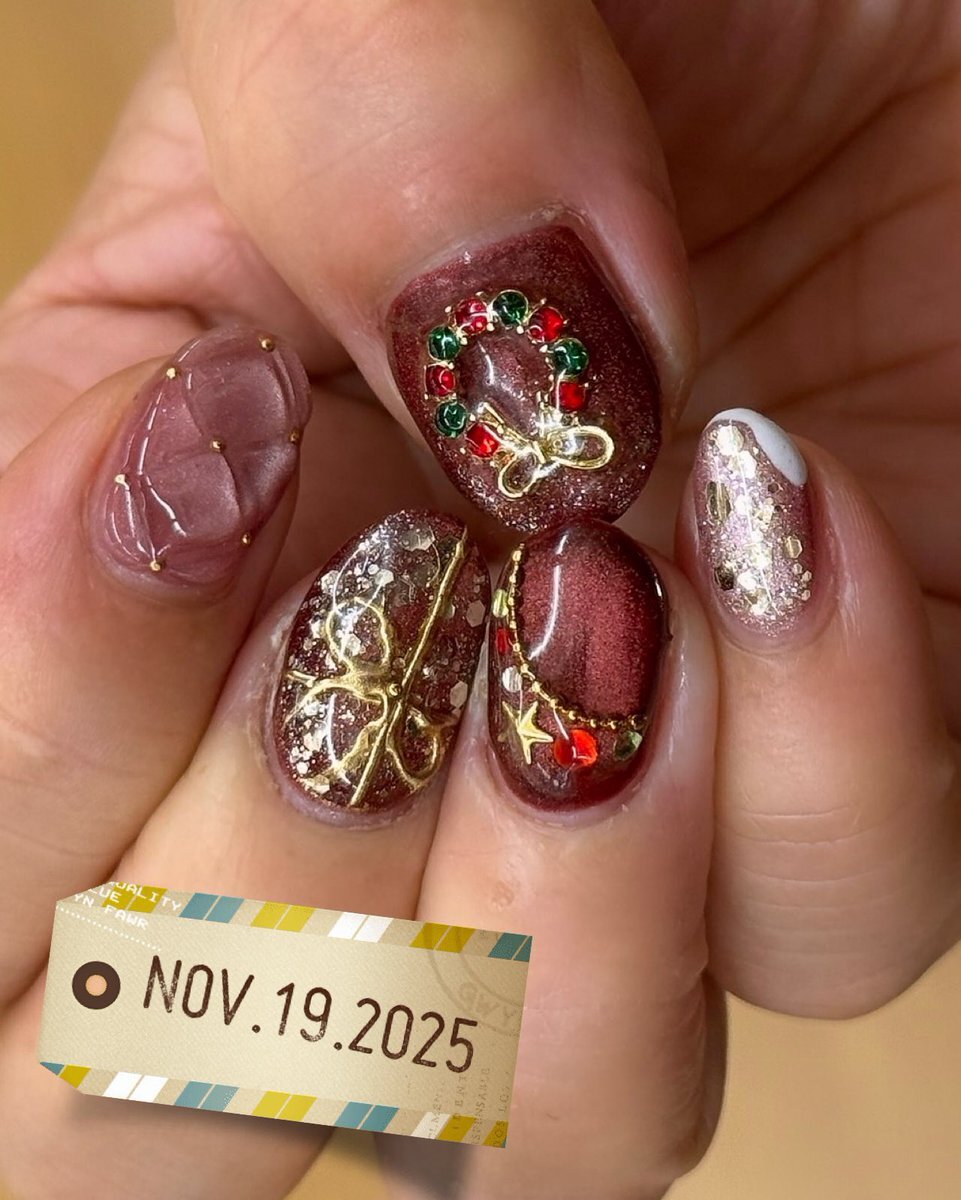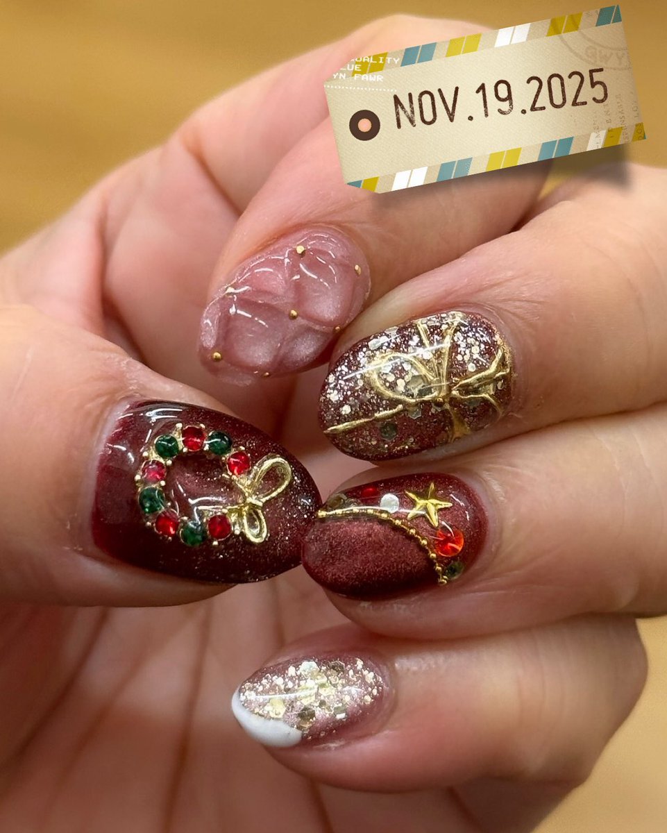 11/19にネイルチェンジ💅早い気もするけどクリスマスデザイン🌲 中指リボンを描いてもらったけどラメがキツ過ぎて目立たない😣私の指示失敗😢 #ネイル #ジェルネイル #デザインネイル #マグネットジェル #クリスマス #クリスマスネイル #持ち込みデザイン #リース pic.x.com/VBdS54ku29