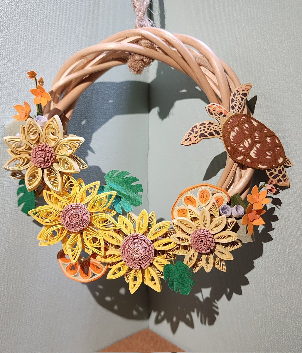 『アオウミガメ』×『ひまわり』 南国風のリースを作ってみました! 個体差はありますが体内の脂肪が「青い(緑色)」という事からアオウミガメと呼ばれているそうです。 初めて知った時は凄く驚きました! #お花屋さんの水族館 #クイリング #アオウミガメ #切り絵 #リース #ペーパークラフト pic.x.com/gs7kC2Zuhm