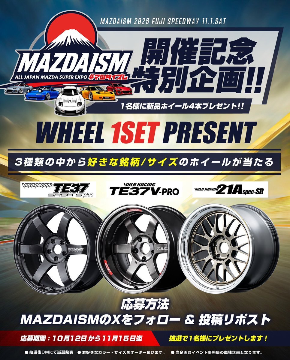 【マツダイズム富士2025開催記念!】 新品ホイール4本が当たる! 本気のSNSプレゼント企画! 当選者はRAYS VOLK RACINGの3種から 好きなサイズ・カラーを オーダー出来る超太っ腹企画! ⚫︎応募方法 ①この投稿をリポスト ②マツダイズムの公式アカウントをフォロー 《 期間10月12日〜11月15日迄 》