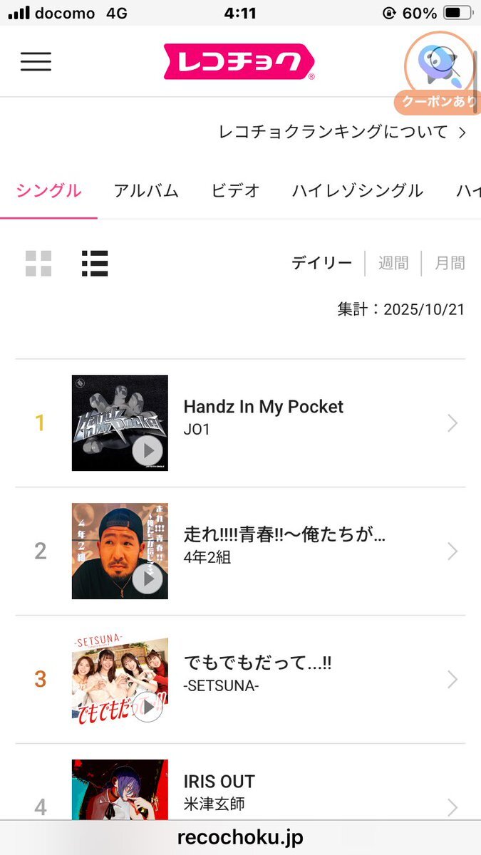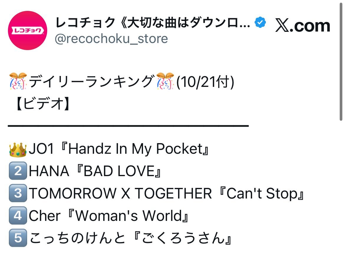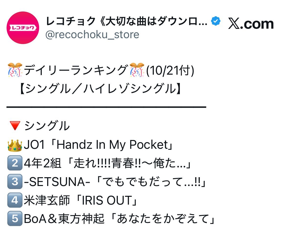 レコチョク10/21デイリーランキング シングルとビデオで1位🥇ツートップ達成 JO1おめでとう🎉 #レコチョク #ランキング #JO1 @official_jo1 #HandzInMyPocket JO1 | 'Handz In My Pocket' Official MV youtu.be/wniN-2kFKRc?si… @YouTubeより pic.x.com/WhiPZNvpnT