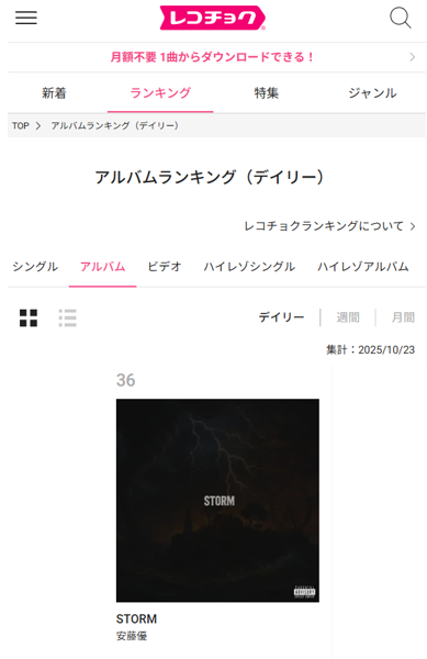 👊#安藤優 さん 2nd Album【#STORM】 #レコチョク デイリーランキング(10/23付) 【アルバム部門】36位です🙌💫 既出でしたらスミマセン そして,こういう情報って Artistご本人に連絡や通知がいくか否か分かりかねますが あの…GRITって近年稀にみるヤバさですよね? @recochoku_store/@recochoku_jp pic.x.com/Xm0zkSmeJh x.com/recochoku_stor…