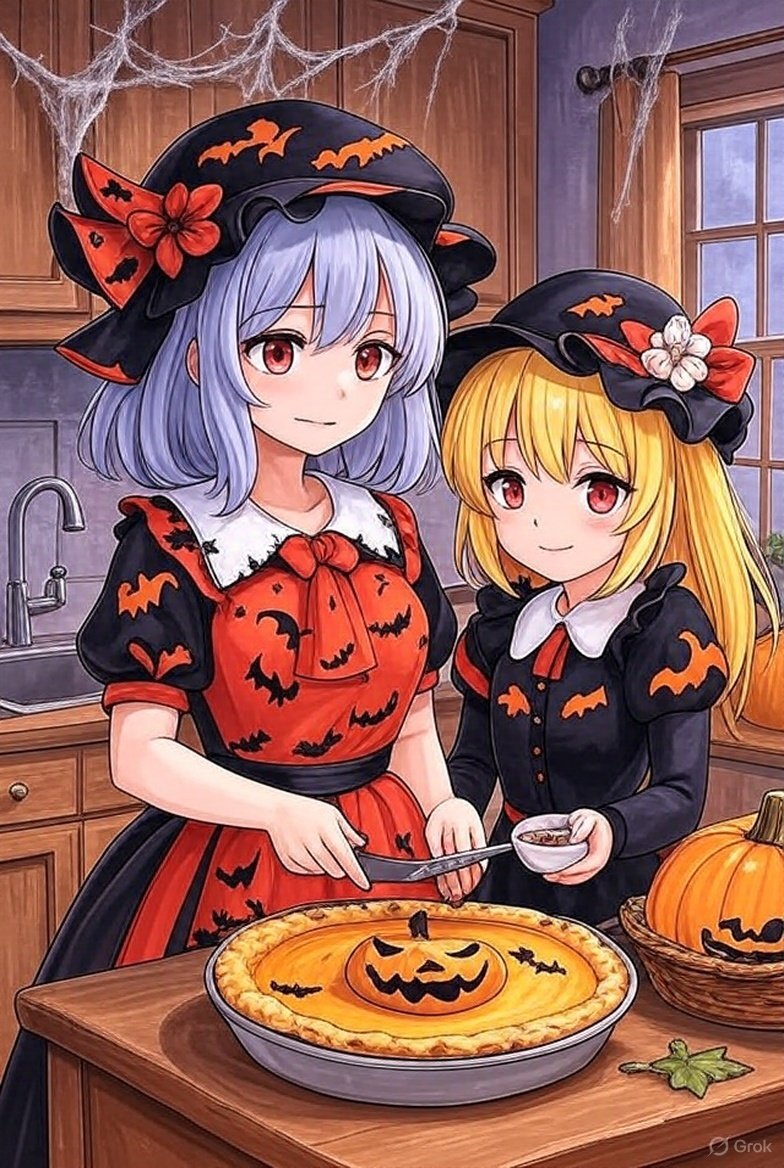 レミリア: 「フラン、このパイ、飾り付けが一番大切よ!💝✨️」 フラン: 「まかせて!これでおいしさを**きゅっとしてドカーン!**するんだから!🥧✨」 #レミフラ #ハロウィンイラスト2025 #東方Project #GrokImagine pic.x.com/OYl0DkkkJb