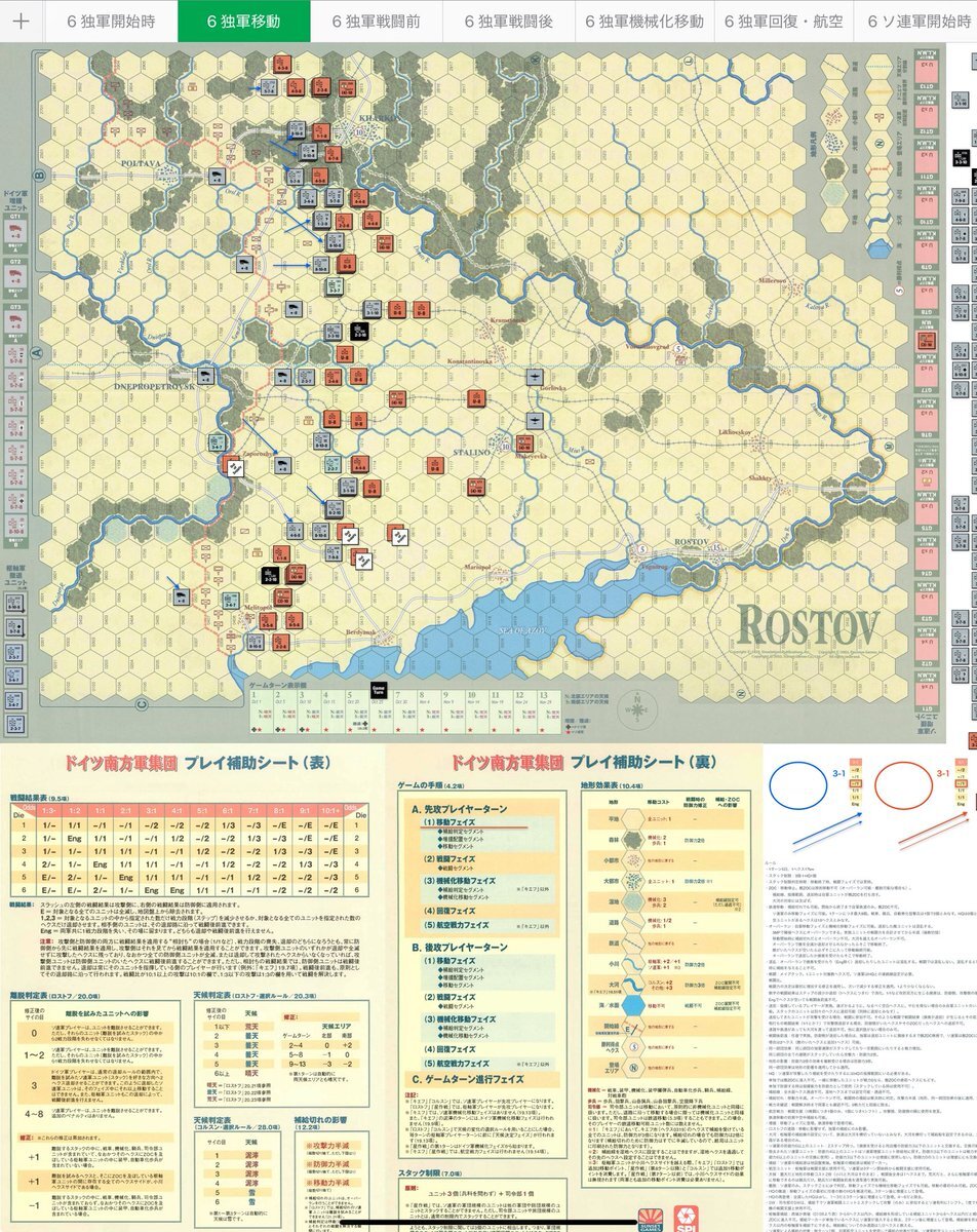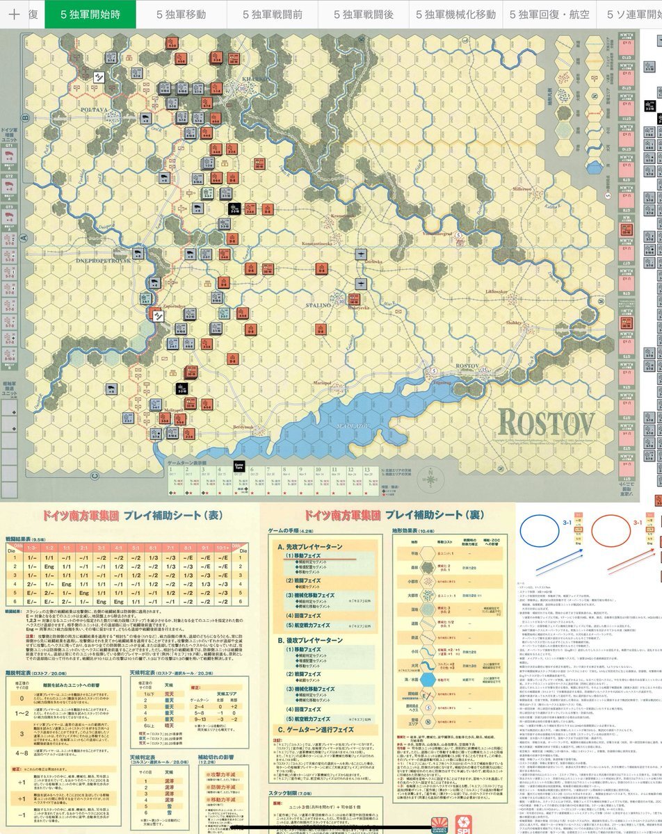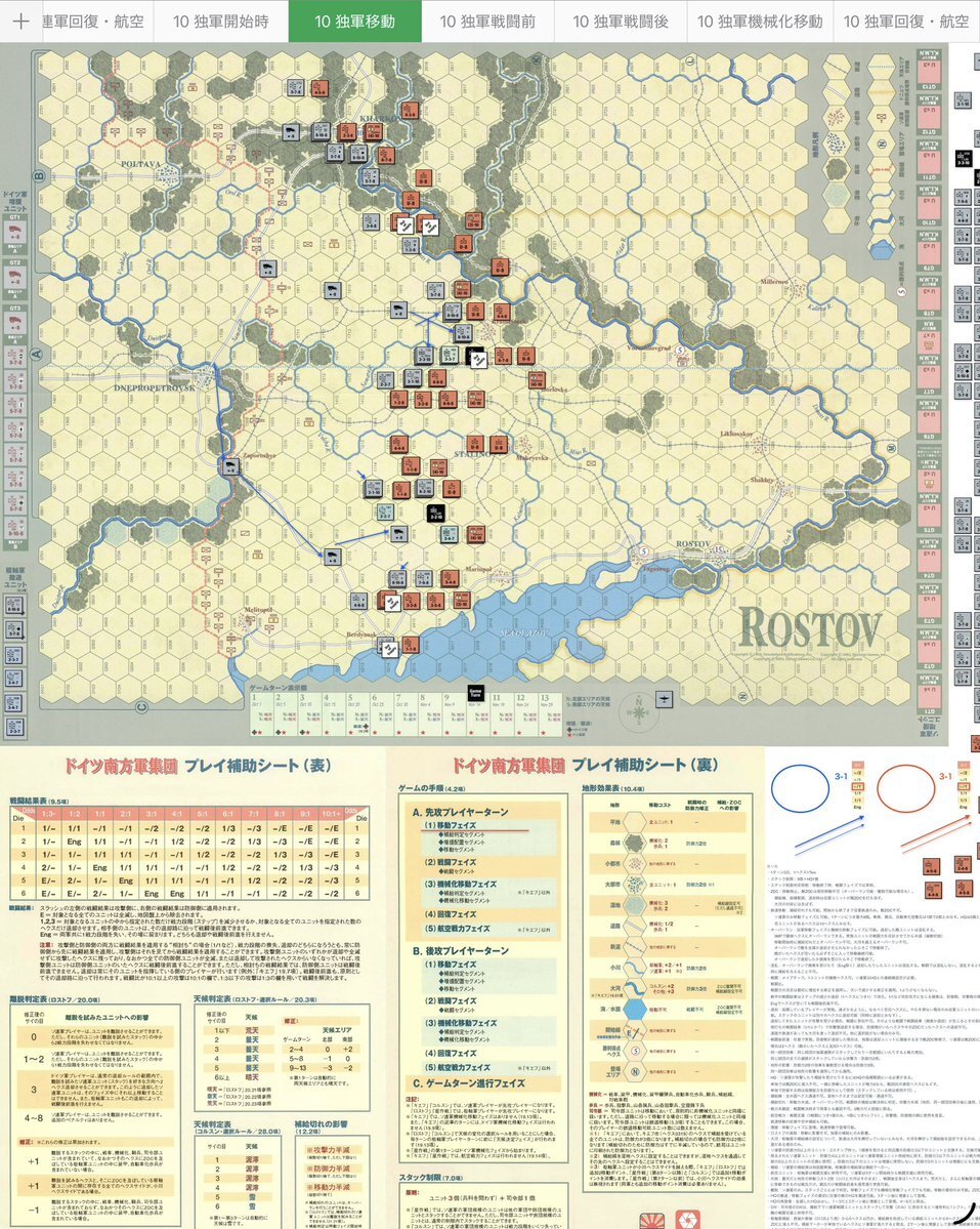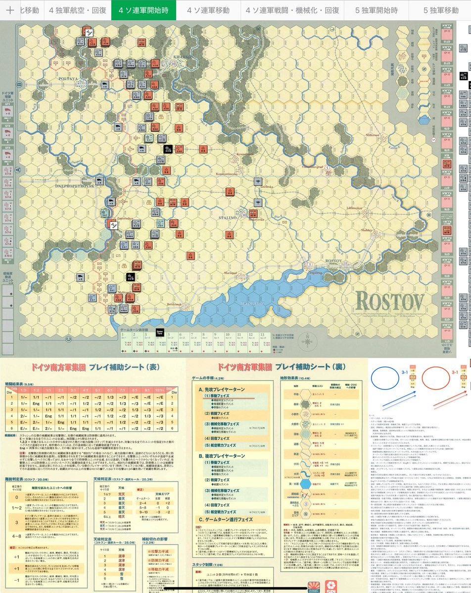 季節のゲーム『ドイツ南方軍集団 ロストフ』(1979・2002 )。 第5ターン、1941年10月20日〜24日の独軍の移動・戦闘・機械化移動です。 このターンは6箇所で戦闘。ソ連軍を退却させ、戦闘後前進で食い込んでいきます。 ハリコフ付近の北部、中部、南部の3箇所で突破口を形成しつつある。ような気も。