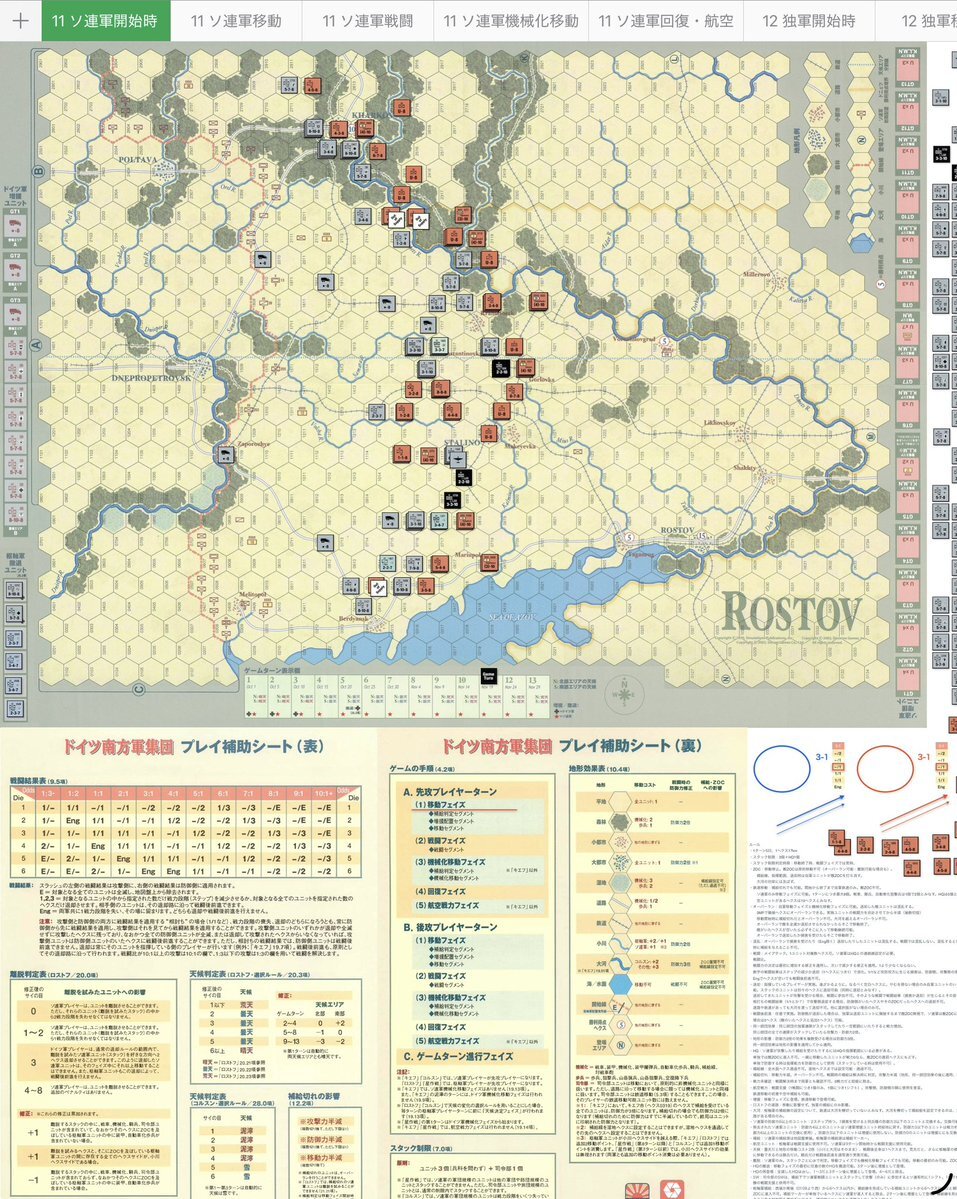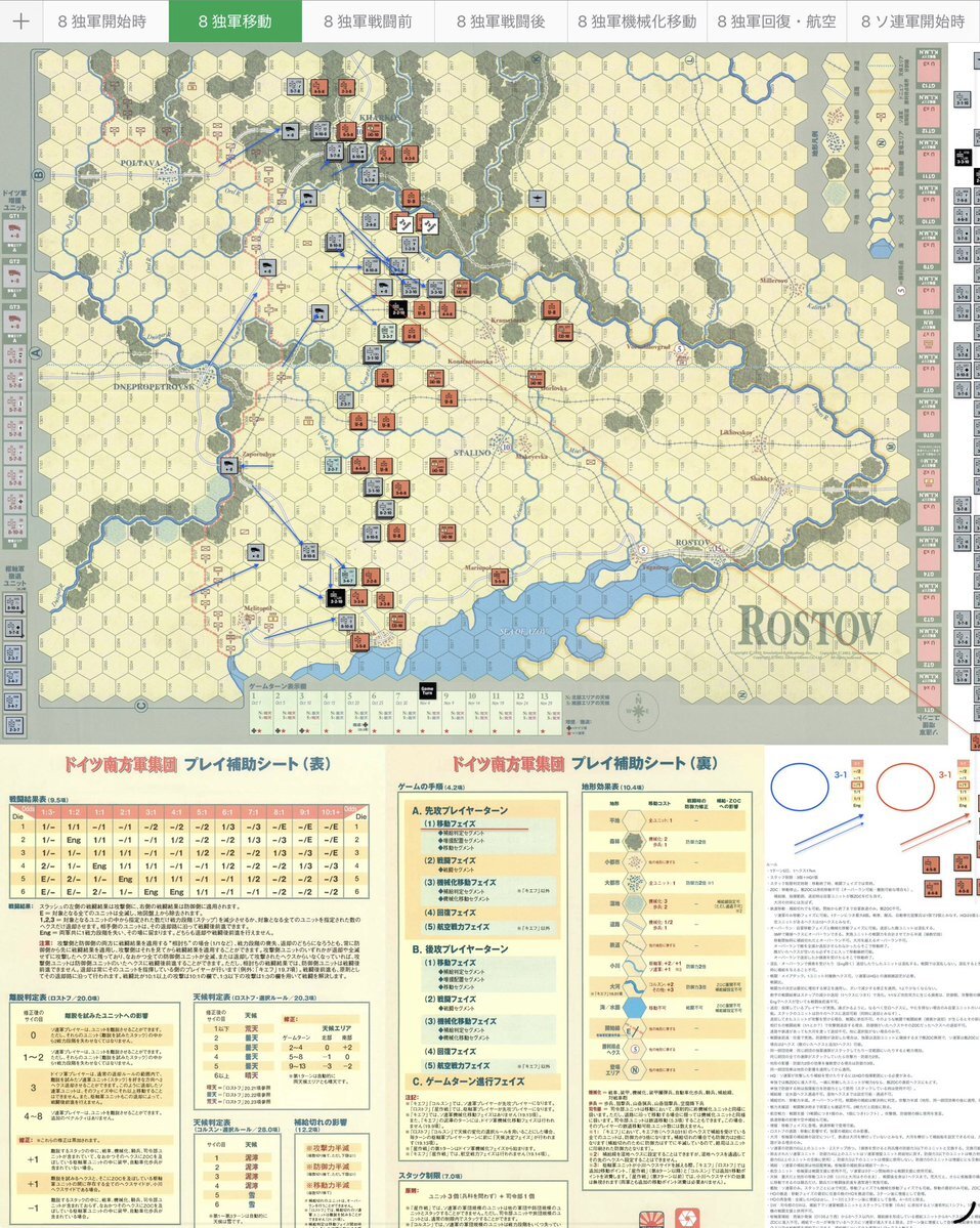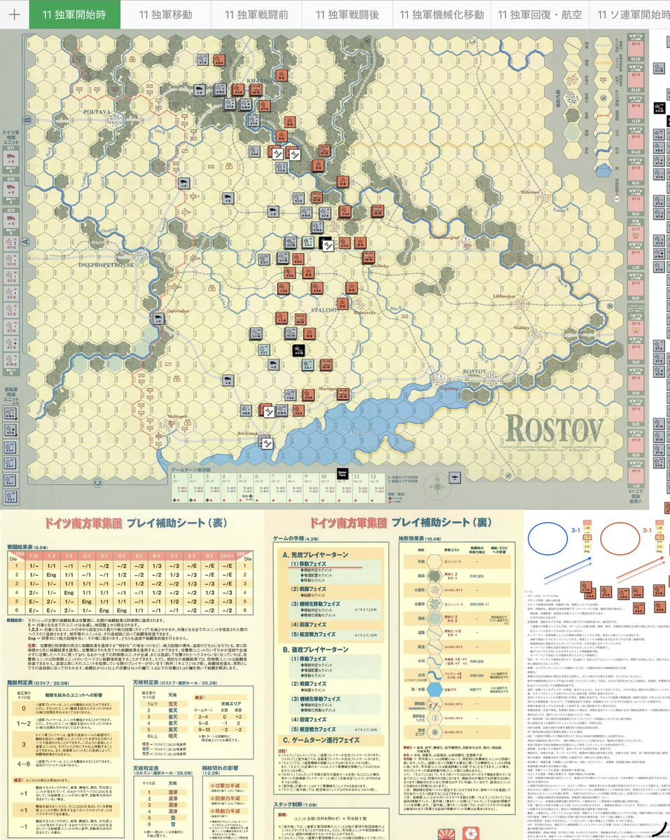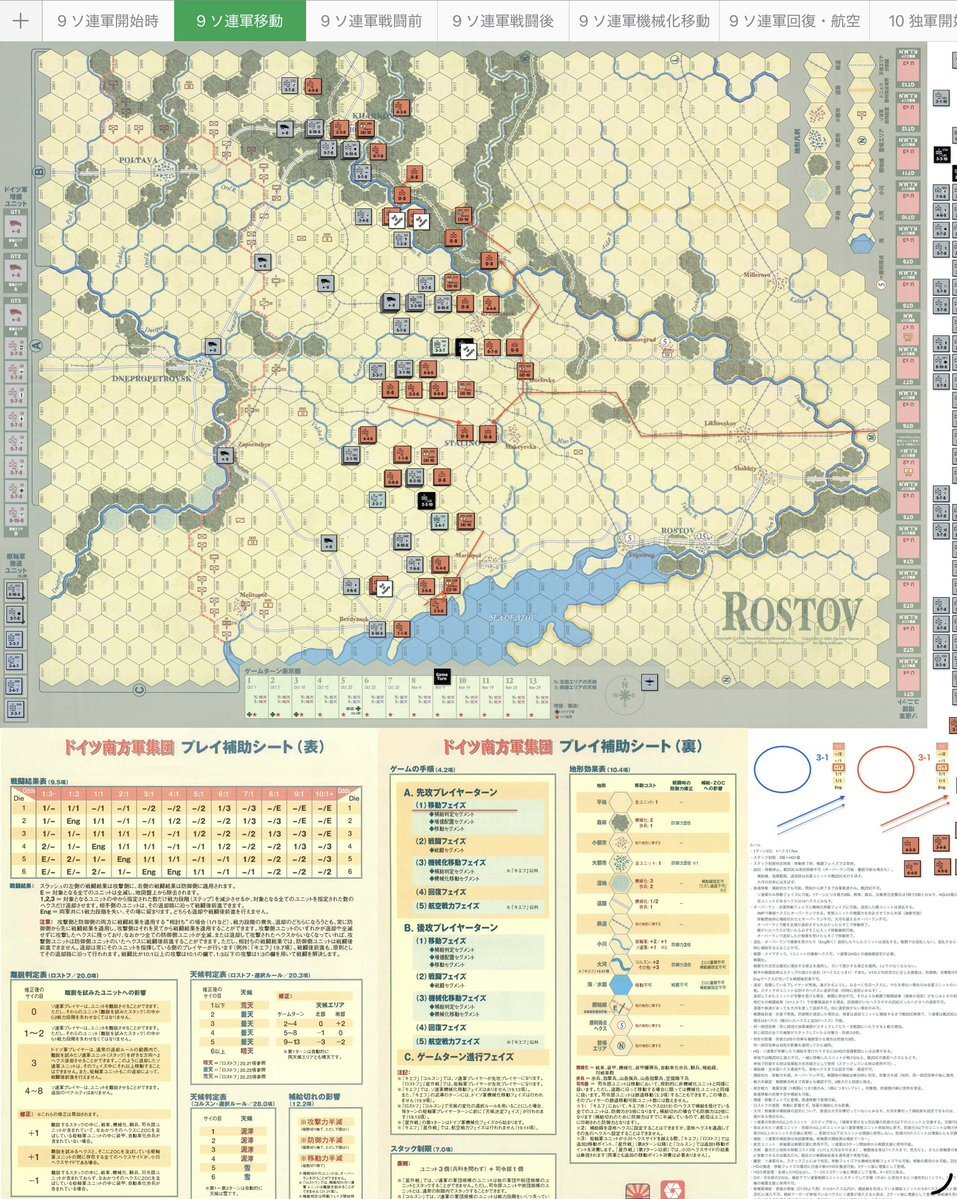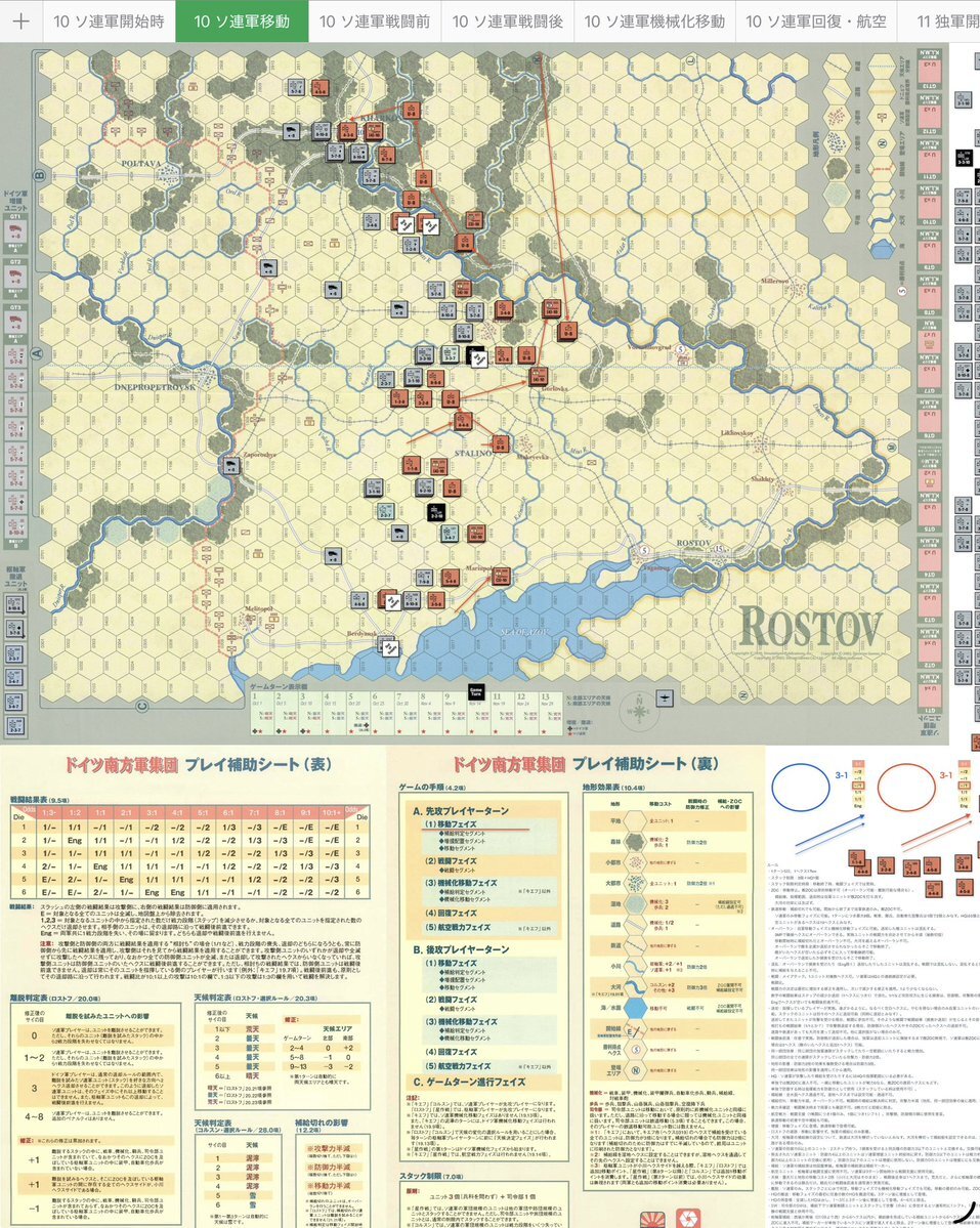 季節のゲーム『ドイツ南方軍集団 ロストフ』(1979・2002 )。 第5ターン、1941年10月20日〜24日の独軍の移動・戦闘・機械化移動です。 このターンは6箇所で戦闘。ソ連軍を退却させ、戦闘後前進で食い込んでいきます。 ハリコフ付近の北部、中部、南部の3箇所で突破口を形成しつつある。ような気も。