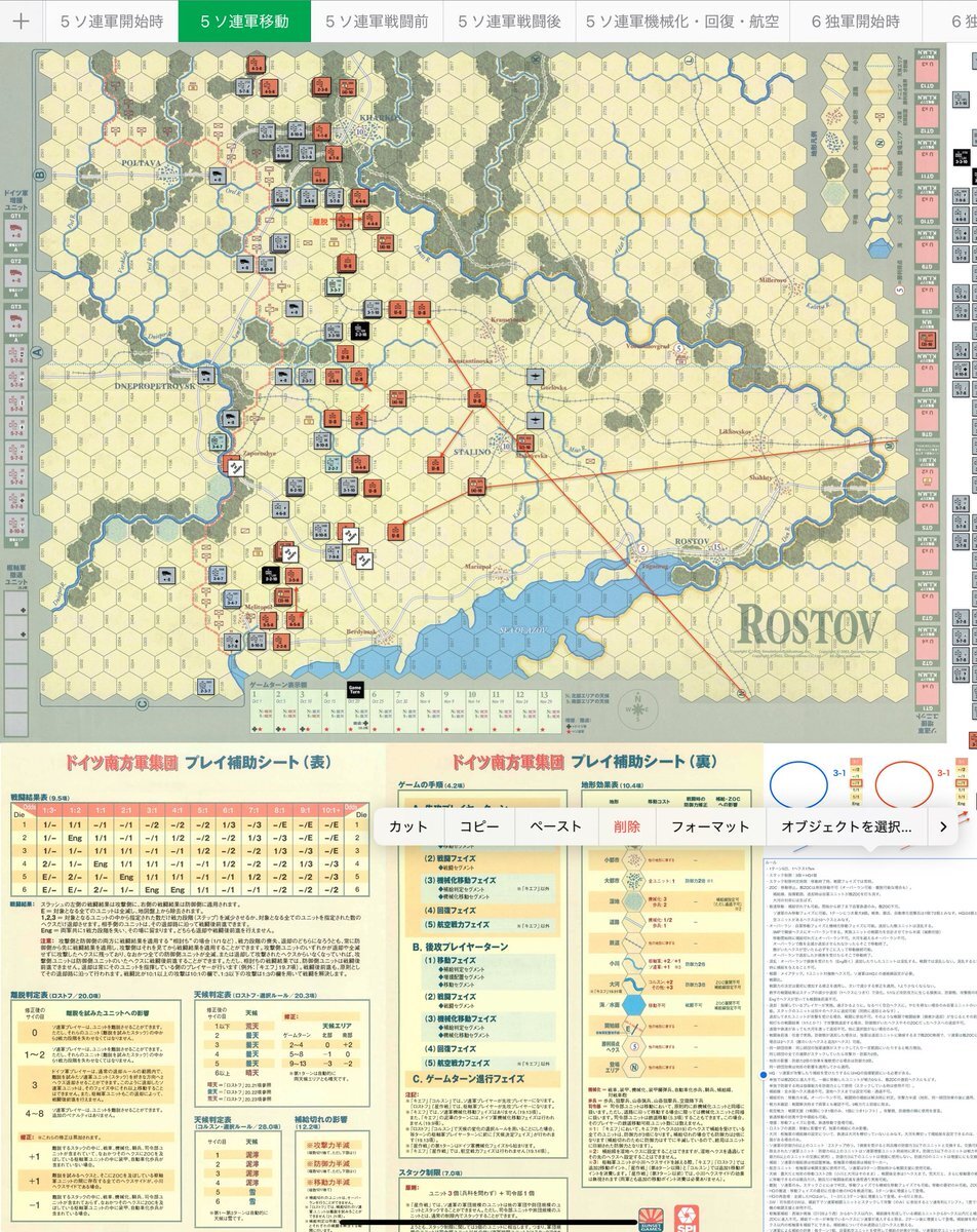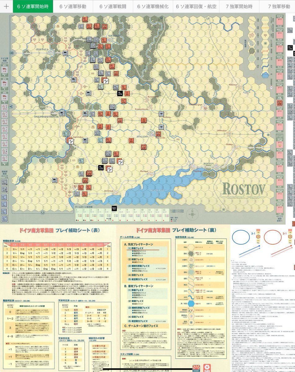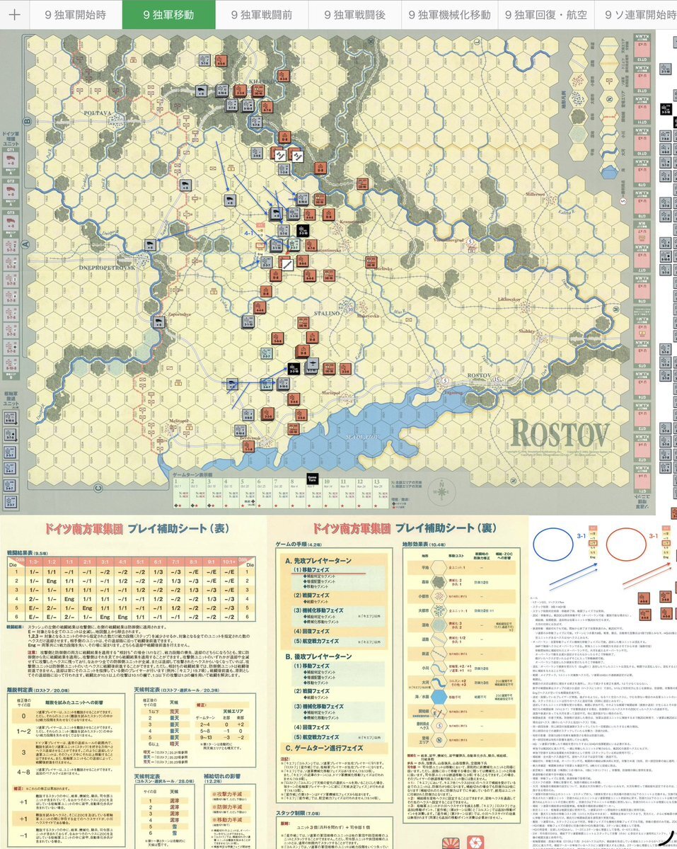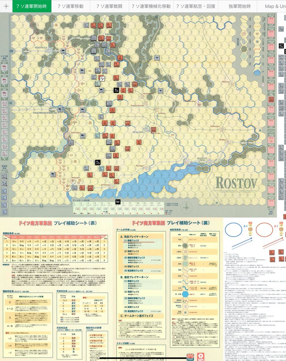 季節のゲーム『ドイツ南方軍集団 ロストフ』(1979・2002 )。 第5ターン、1941年10月20日〜24日の独軍の移動・戦闘・機械化移動です。 このターンは6箇所で戦闘。ソ連軍を退却させ、戦闘後前進で食い込んでいきます。 ハリコフ付近の北部、中部、南部の3箇所で突破口を形成しつつある。ような気も。