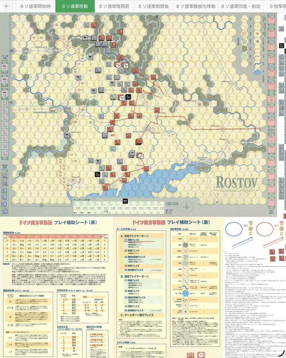 季節のゲーム『ドイツ南方軍集団 ロストフ』(1979・2002 )。 第8ターン、1941年11月4日〜11月8日のソ連軍の移動・戦闘・機械化移動です。 1ユニットを失ったハリコフに増援を送り込み、離脱と2箇所の低比率攻撃で戦線を整えます。 しかしこれだけ兵力があるならモスクワ方面に回せればとも思います。